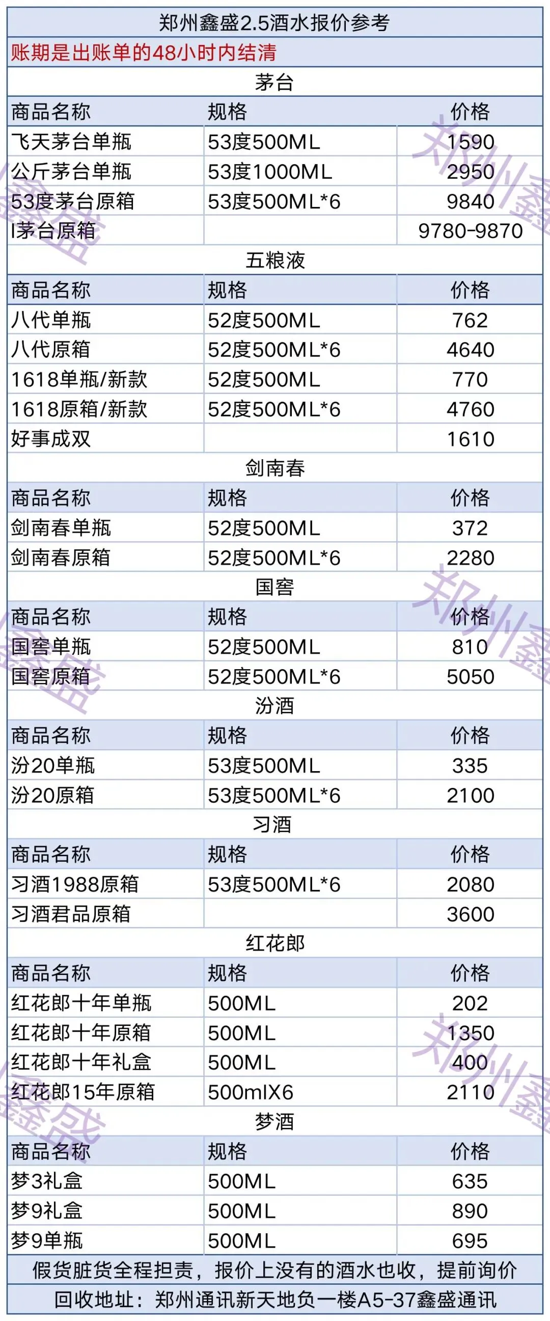 郑州鑫盛2.5数码酒水回收报价