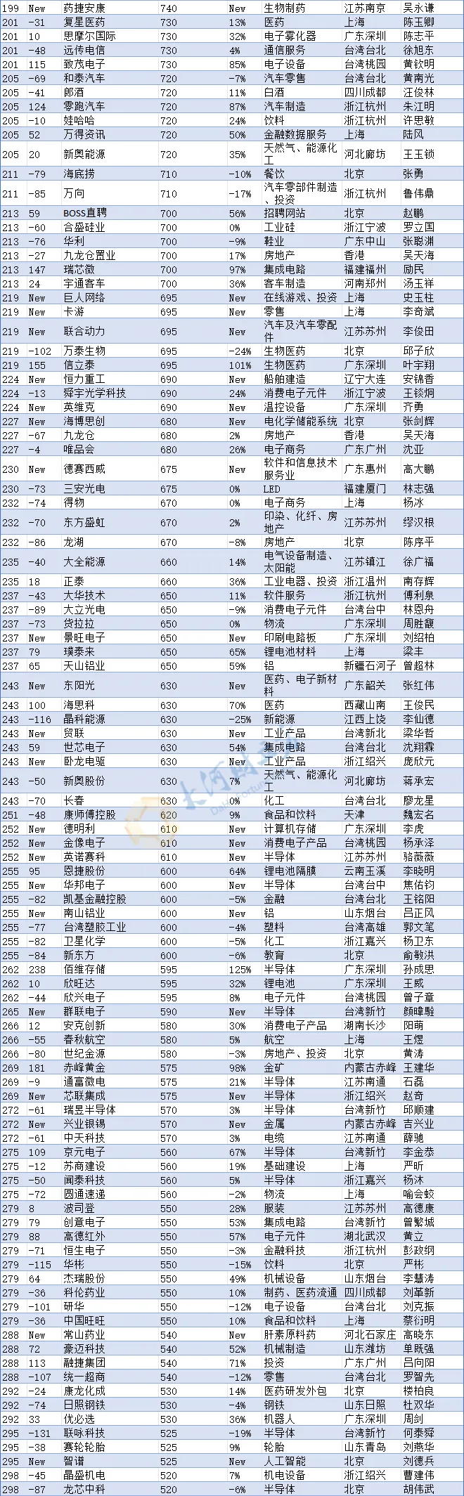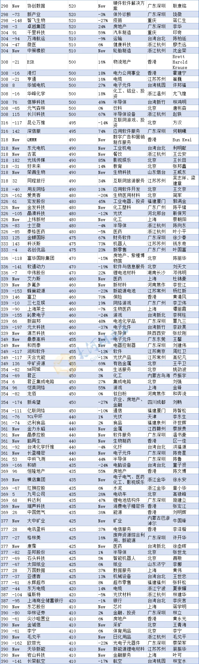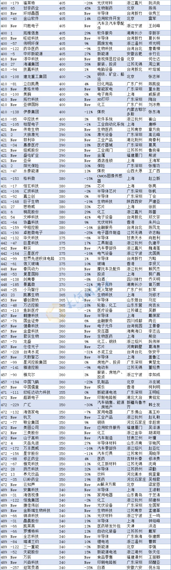 这7家企业分别为洛阳钼业(价值3550亿元,排名27)、牧原(价值2720亿元,排名38)、蜜雪(价值1430亿元,排名92)、宇通客车(价值700亿元,排名213)、多氟多(价值460亿元,排名339)、龙佰(价值450亿元,排名354)、仕佳光子(价值360亿元,排名457)。7家上榜企业总价值9670亿元。