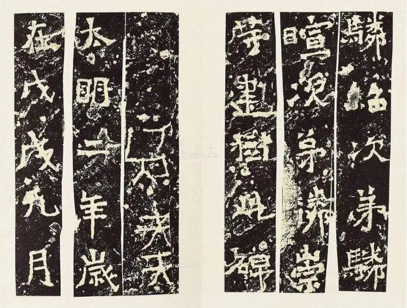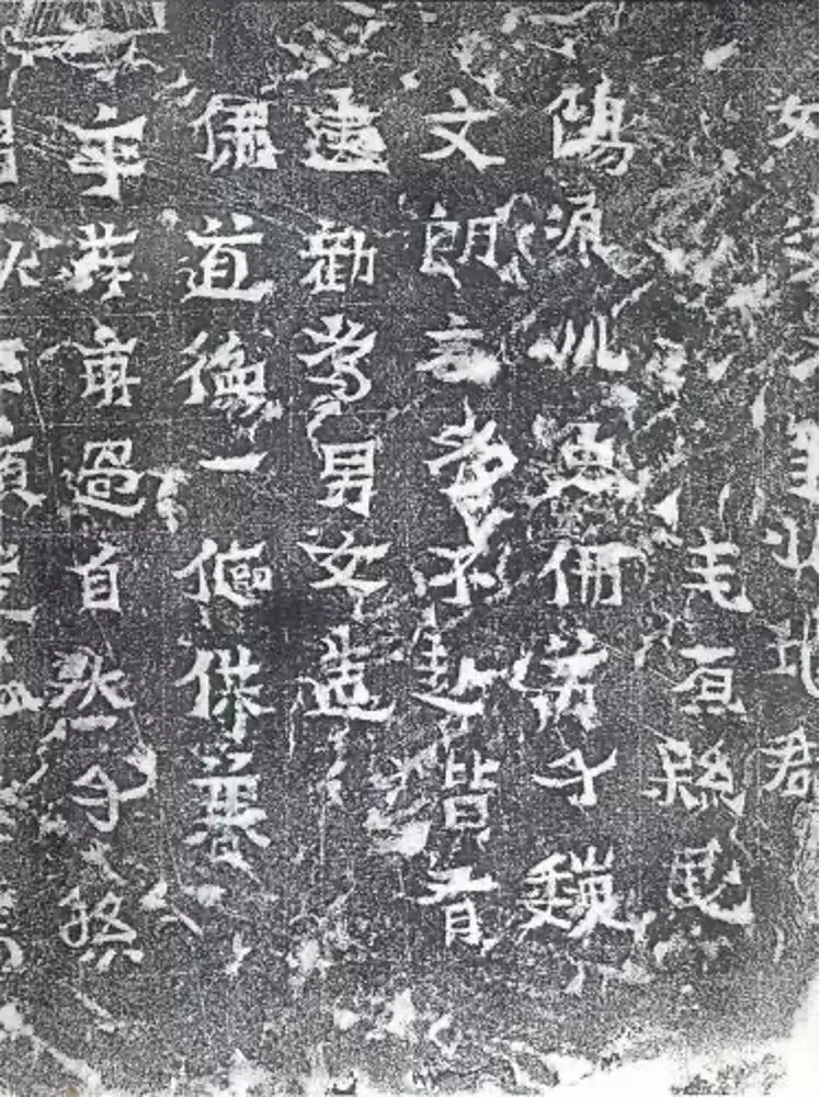 前面我们曾经讨论过北凉铭石体与西晋、曹魏时期的一些不同。就主笔横画而言,北凉体左右翻翘,就结构而言,仍呈方正,在视觉上比较别扭。如果在除了主笔横画的翻翘以外,其余的横画也要表现翻翘特征以获取统一的话,那么字形结构本身的稳定性就要打破,它要求其余的如波、捺、竖、勾等因顺势榫接,也要按照横画的向度相应地发生变化,以回应某种视觉平衡。就像我们前面提到的《魏文朗佛道造像记》一样。但是,这样的体式虽然调皮,却有失庄重。那么变革只能从横画本身出发。