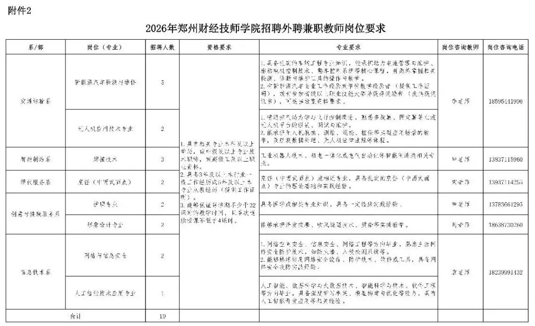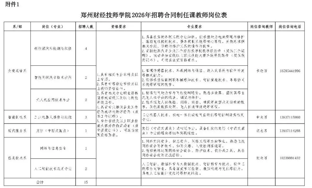 本次招聘合同制任课教师15名,具体岗位及要求详见《郑州财经技师学院2026年招聘合同制任课教师岗位表》(附件1)。招聘外聘兼职教师19名,具体岗位及要求详见《郑州财经技师学院2026年招聘外聘兼职教师岗位表》(附件2)。