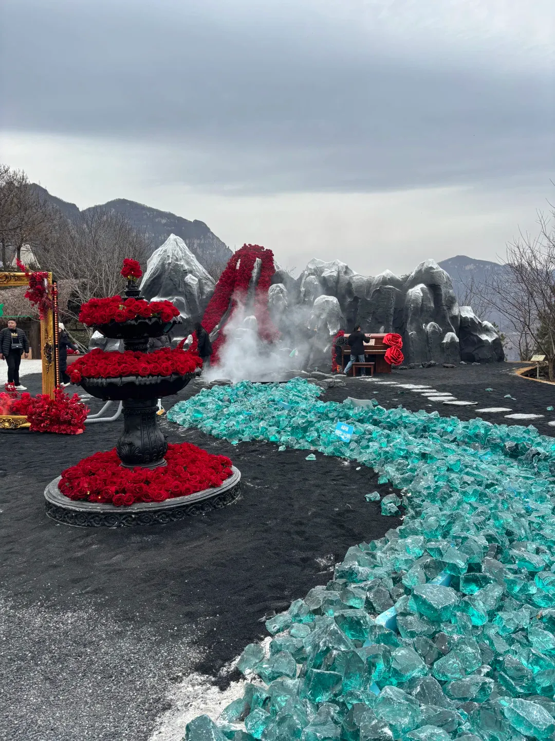 斥巨资打造的幻雪秘境里,整片山坡缀满冰雕玫瑰,搭配黑红撞色背景,浪漫又出片,穿亮色或浅色衣服站在旁边,反差感拉满,随便摆个姿势,都是电影级画面,爱拍照的姐妹绝对不能错过。