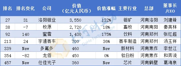 其中,洛阳钼业首次跻身全国前30,成为河南上榜企业领头羊。