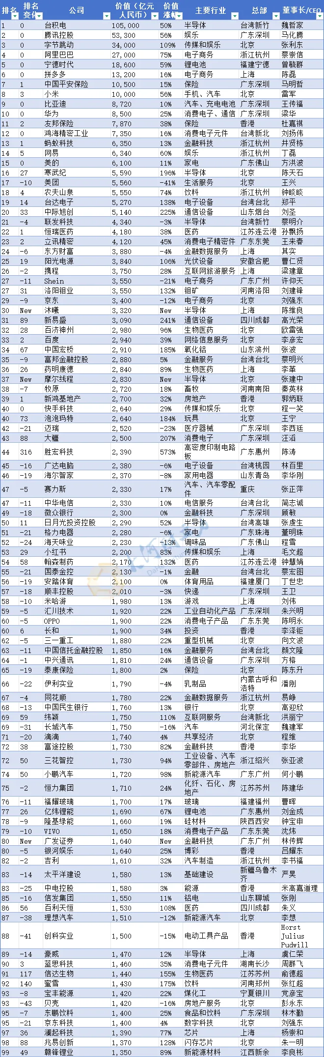 台积电以10.5万亿元,蝉联中国价值最高的民营企业;腾讯凭借1.9万亿元的价值增长,以5.3万亿元稳居第二;字节跳动紧随其后,价值达3.4万亿元,较上年增长1.8万亿元,保持第三位。