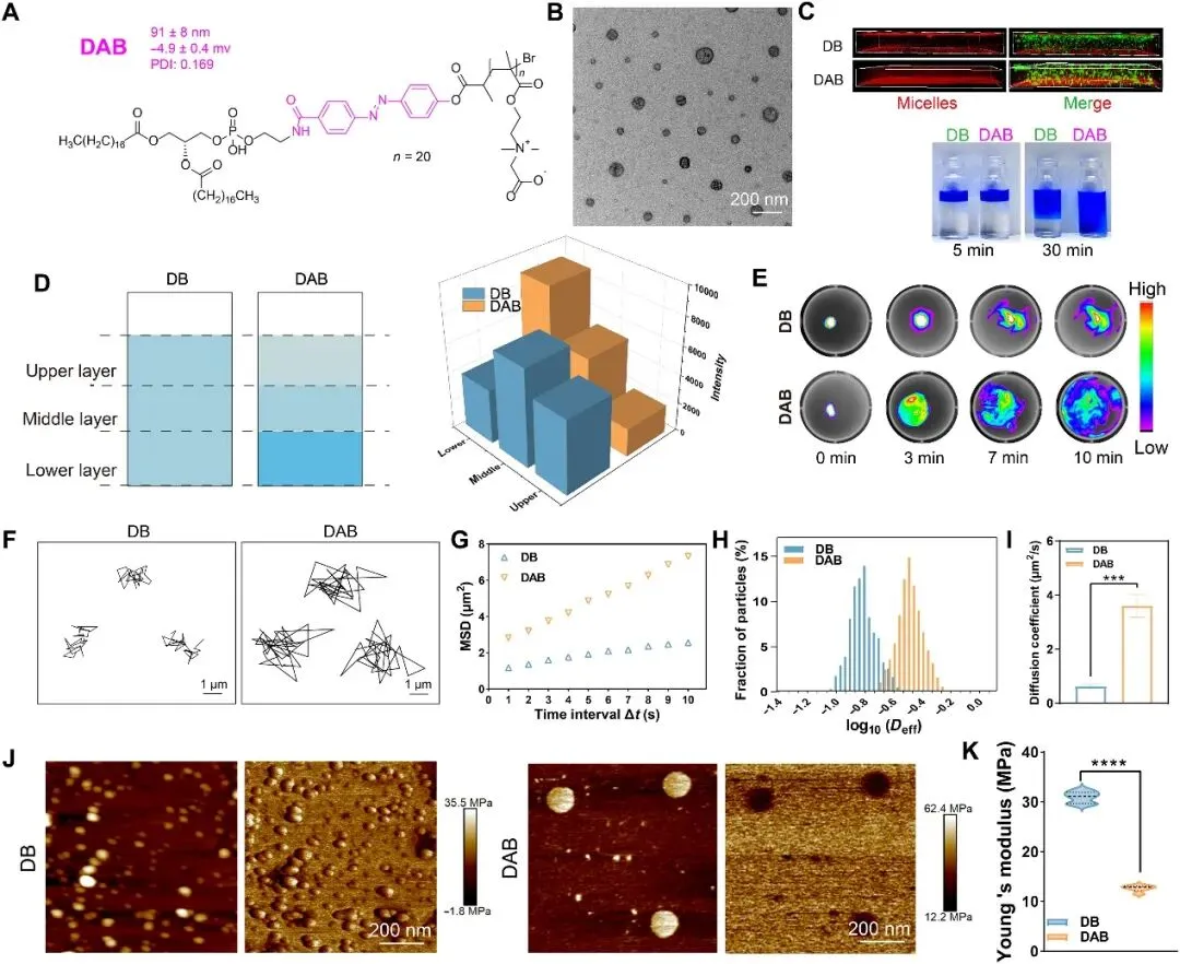 该项研究通过系统比较不同胶束的粘液渗透行为,发现尽管表面组成相似,但其渗透能力存在显著差异。在具有良好物理化学性质的两性离子DB胶束基础上,引入偶氮苯结构制得的DAB胶束,凭借其更低的杨氏模量(更高的机械柔软度),展现出优于DB的粘液穿透性能。通过调控DB与DAB比例,成功构建了机械性能可调的胶束库,其中DAB比例越高,胶束越柔软,在粘液中的扩散能力越强。