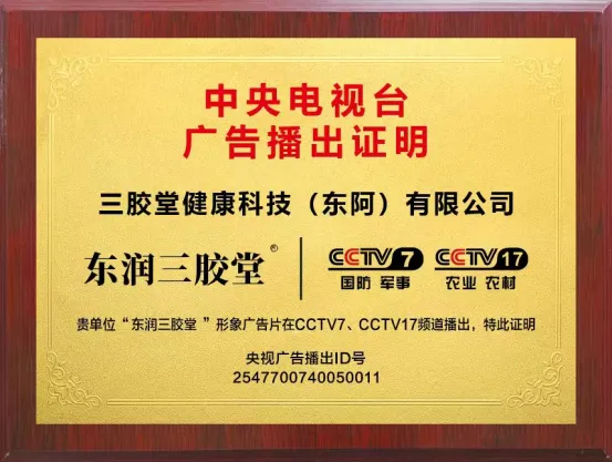 东润三胶堂为中央电视台广告签约品牌,形象广告片在CCTV7、CCTV17频道荣誉播出!