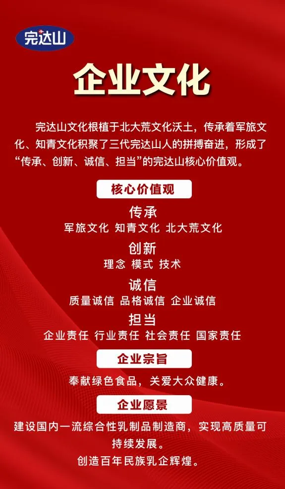 深厚底蕴:完达山乳业,由王震将军于1958年亲手缔造,根植于北大荒沃土,传承军旅文化与知青文化的拼搏精神。