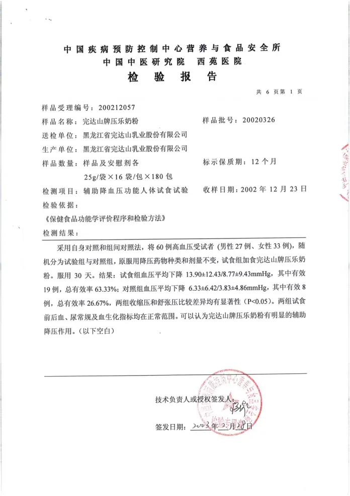 行业唯一性:完达山压宁奶粉,是国内唯一获得“小蓝帽”认证,明确标注具有“调节血压”功能的奶粉。