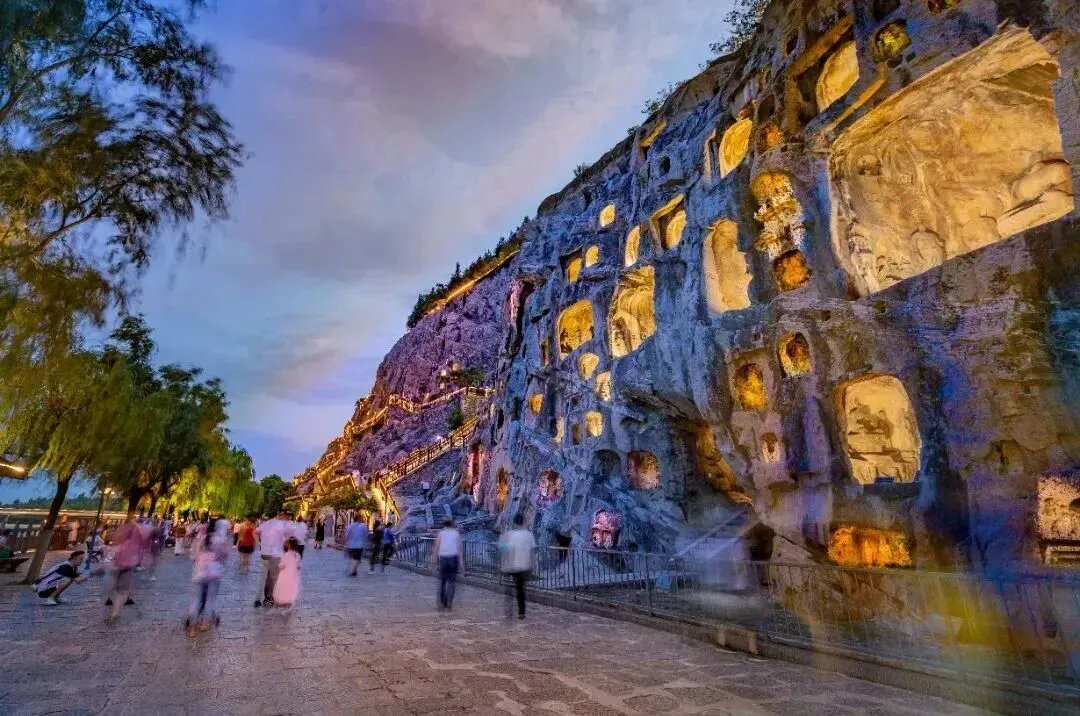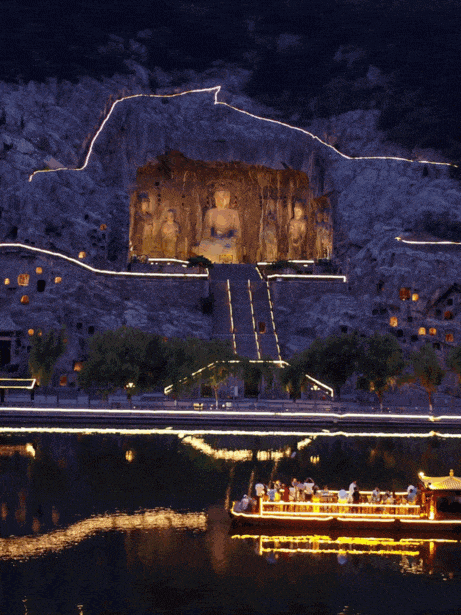 夜游龙门,是灯光与千年石刻的对话。伊河水面倒映着千年造像,,西山窟龛被暖光点亮,卢舍那大佛在夜色中更显庄严静谧。可漫步观景,远眺全景;但需注意,夜间仅开放西山主要步道及核心窟龛,东山石窟、香山寺等区域不开放。景区灯光聚焦佛像,步道较暗,请务必注意脚下安全。(游览约需3.5h)