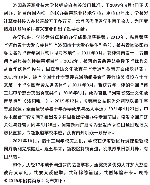 洛阳慈善职业技术学校2026年上半年教师招聘