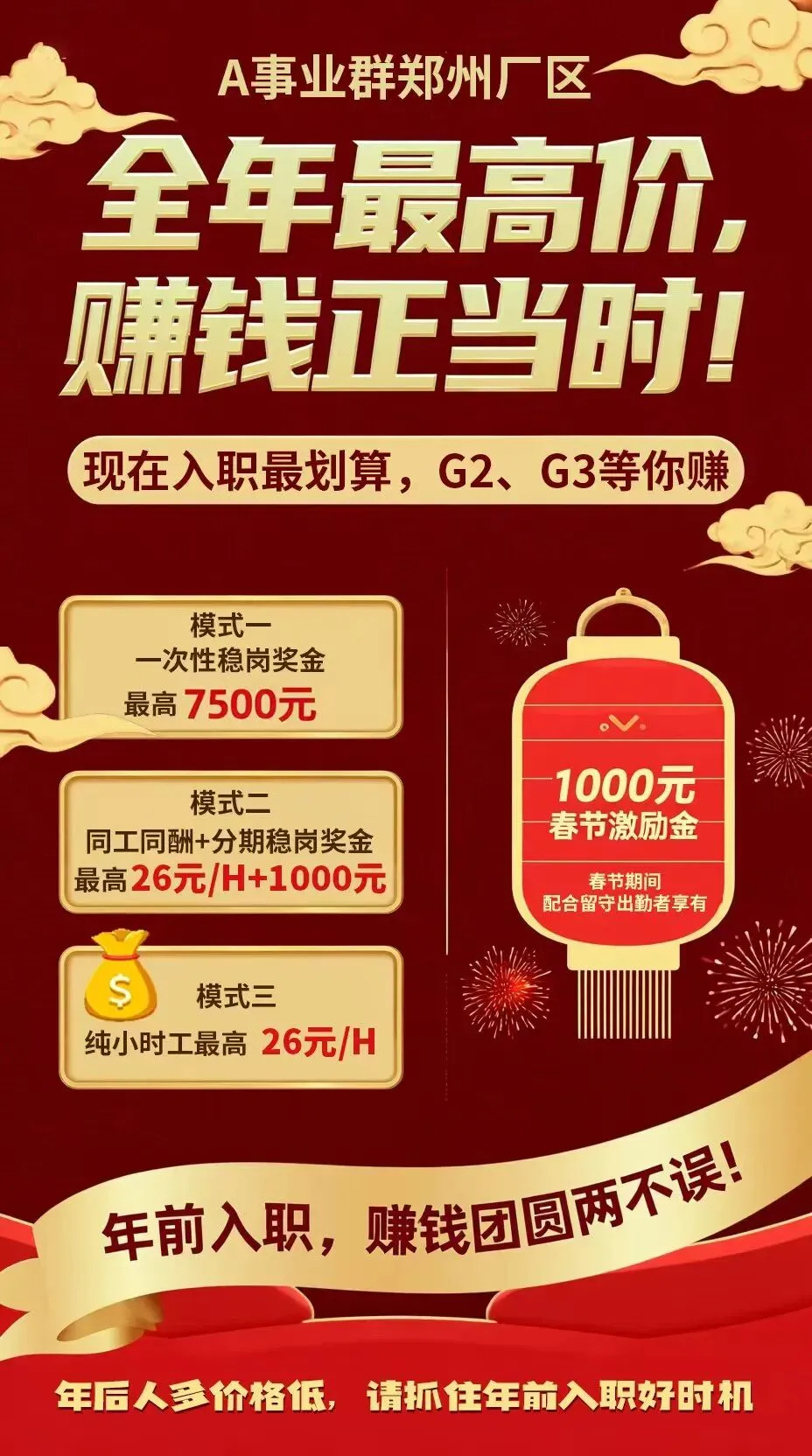 [红包]配合厂区春节期间出勤,最高可额外享有1️⃣0️⃣0️⃣0️⃣元春节出勤激励奖金