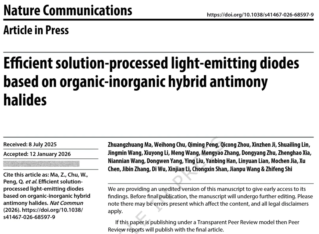 郑州大学单崇新/史志锋&南京工业大学王建浦等人Nature Communications:基于有机 - 无机杂化锑卤化物的高效溶液处理发光二极管