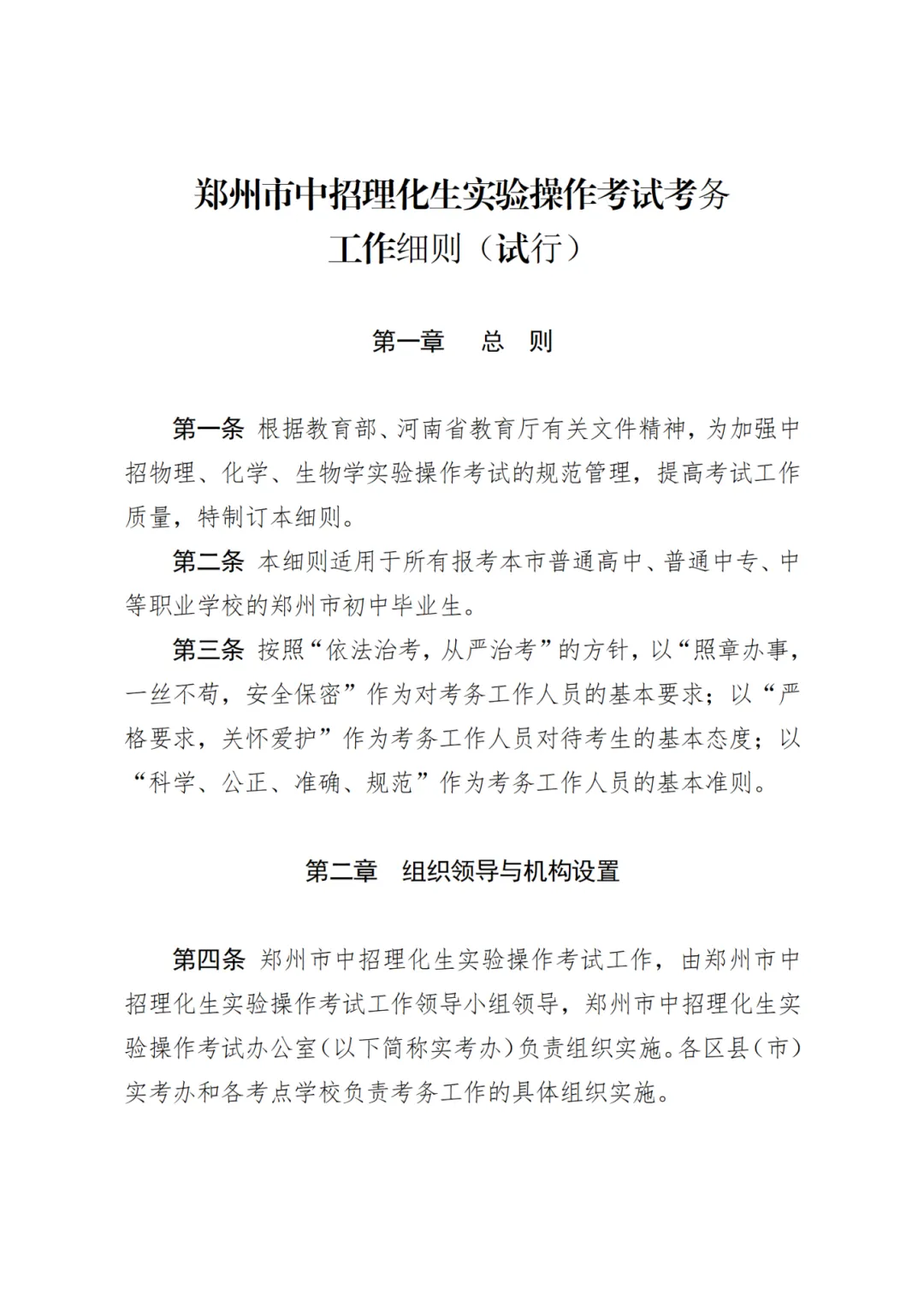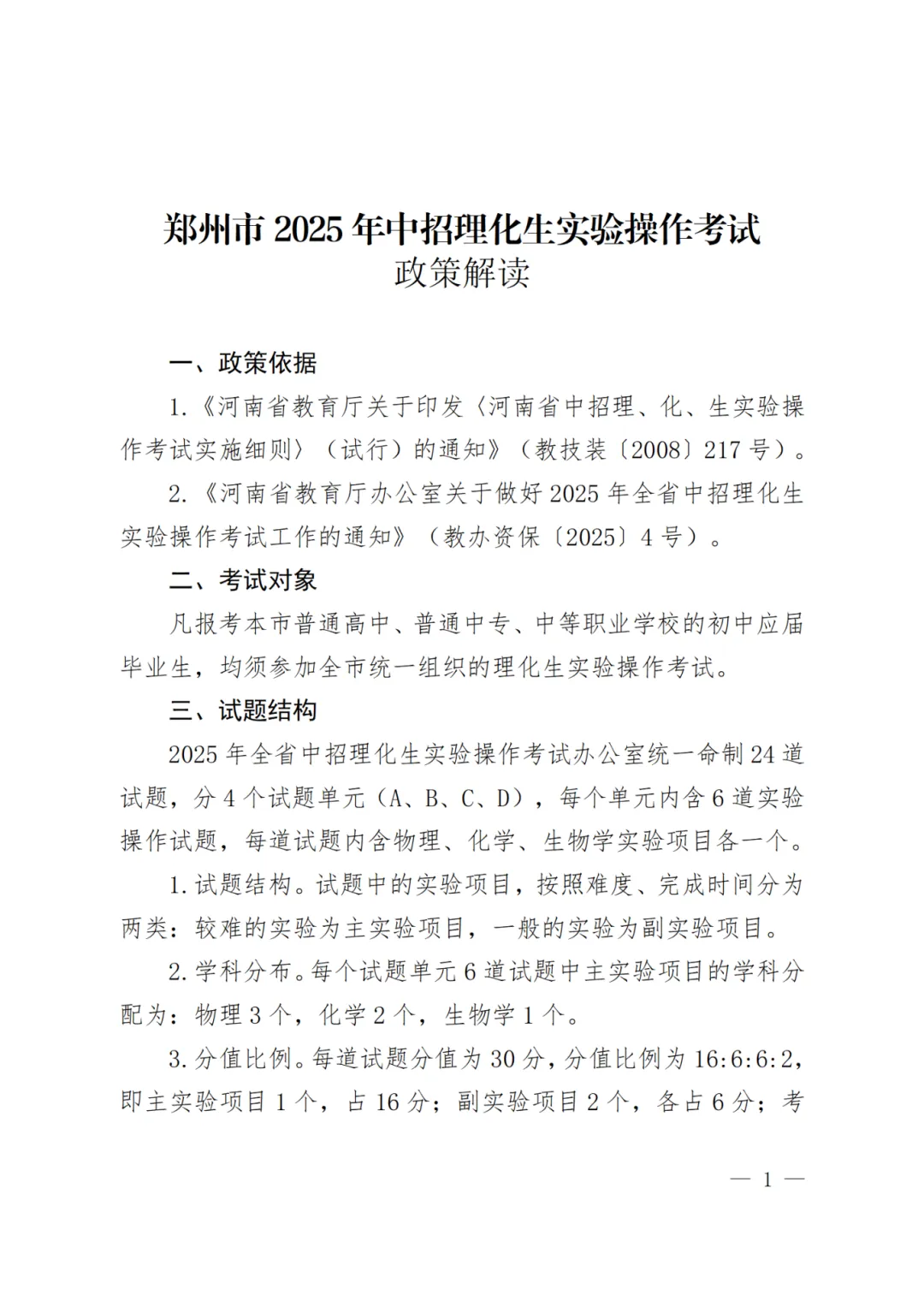 根据《河南省教育厅关于印发河南省中招理化生实验操作考试实施细则(试行)的通知》(教技装〔2008〕217号)和《河南省教育厅办公室关于做好2025年全省中招理化生实验操作考试工作的通知》(教办资保〔2025〕4号)精神,郑州市2025年中招物理、化学、生物学实验操作考试仍纳入中招统一管理。为做好考试工作,现将有关事宜通知如下。