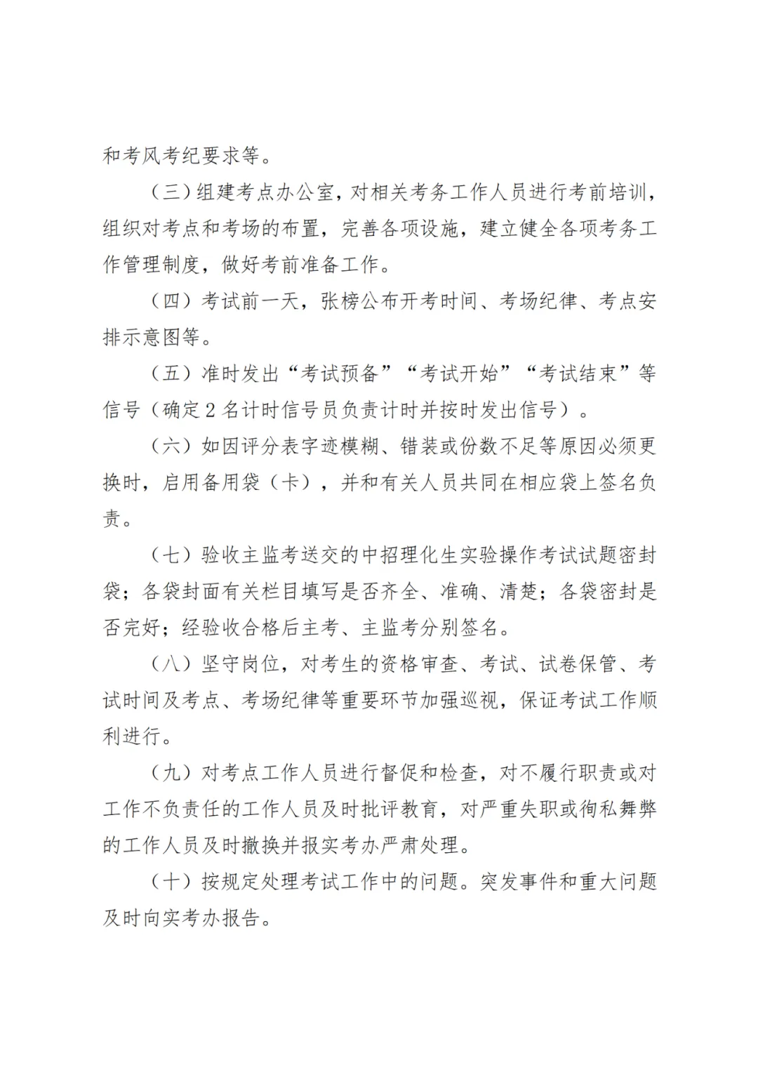 (三)全面准备,周到服务。各县(市)要认真总结过去的经验,在科学合理设置考点的同时,做好中招理化生实验操作考试所需教学仪器、设备,特别是易损易耗品的组织供应工作,保证按时按需供应到位。在组织理化生实验操作考试工作时,要充分考虑自身特点,可以集中考试,也可以组织考务队伍送考下乡。考点学校在交通、场地、设施等方面要为考生提供细致周到的服务,以保证理化生实验操作考试的质量和标准。