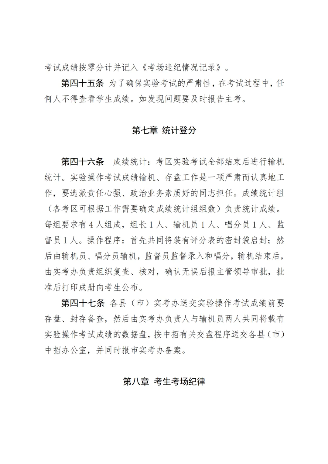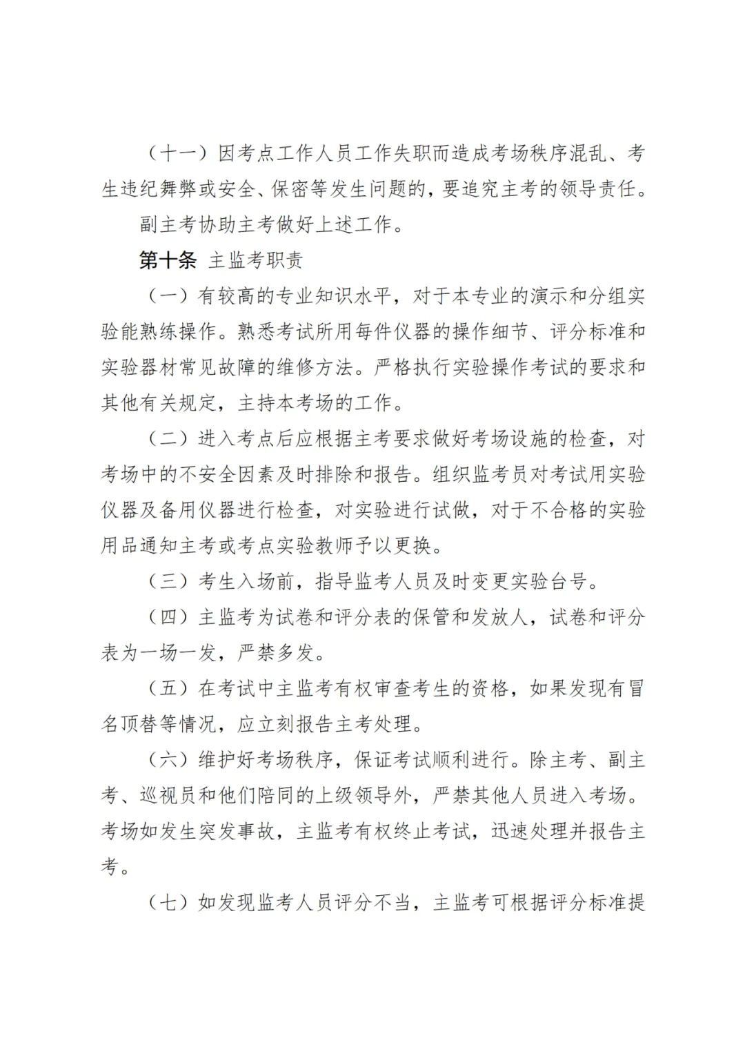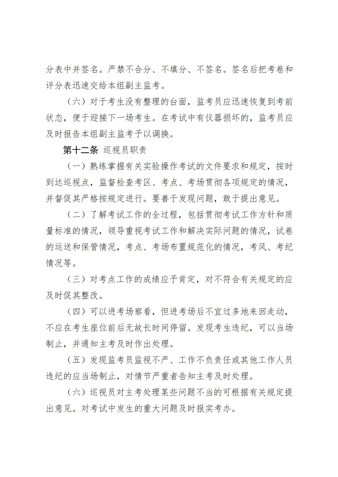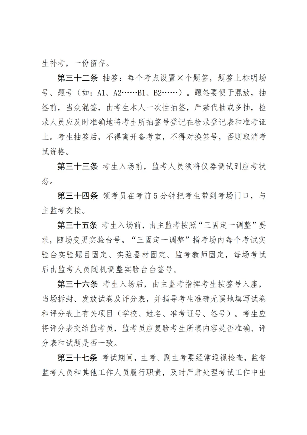 (二)采取措施,公平公正。要加强监考人员的纪律教育,完善监督机制。要加强监考教师的业务培训,使监考教师充分掌握评分标准,做到评分尺度统一,确保监考和评分工作公平、严肃。要严格落实“三固定一调整”(指考场内每个考试实验台实验题目固定、实验器材固定、监考教师固定,每场考试后由监考人员随机调整实验台台签号),严格杜绝各种作弊手段,具备条件的要对考点或考场实行信号屏蔽措施,严防舞弊事件的发生。要严密组织成绩的登分统计工作,要设立专门的保密室,抽调专门人员负责登分统计,切实做到程序严密,相互监督、相互制约。