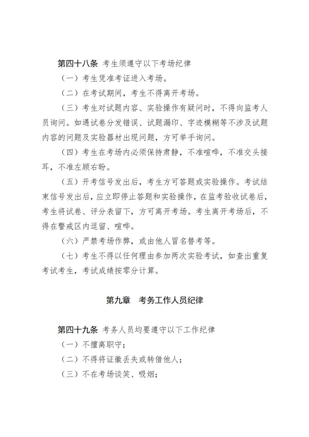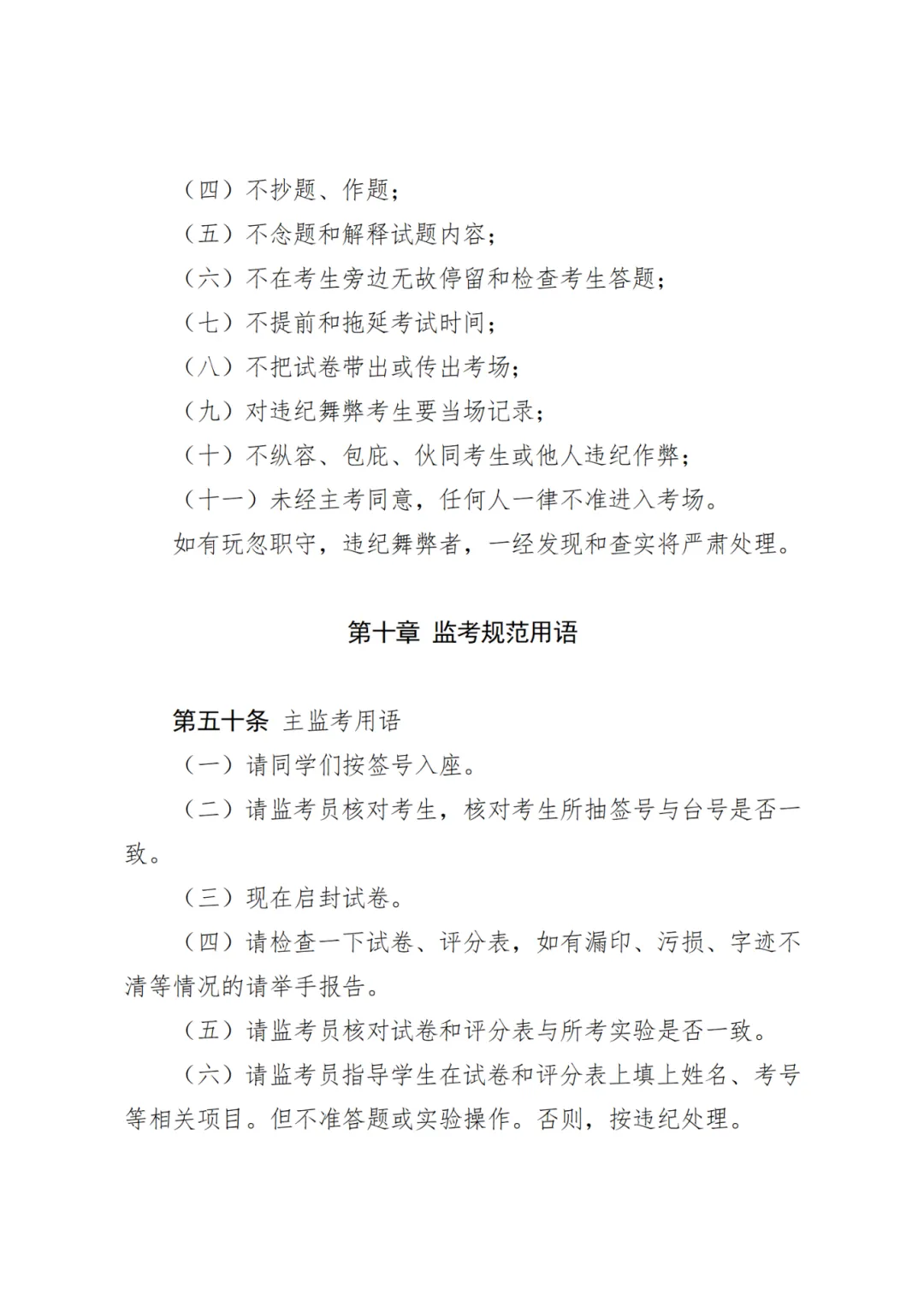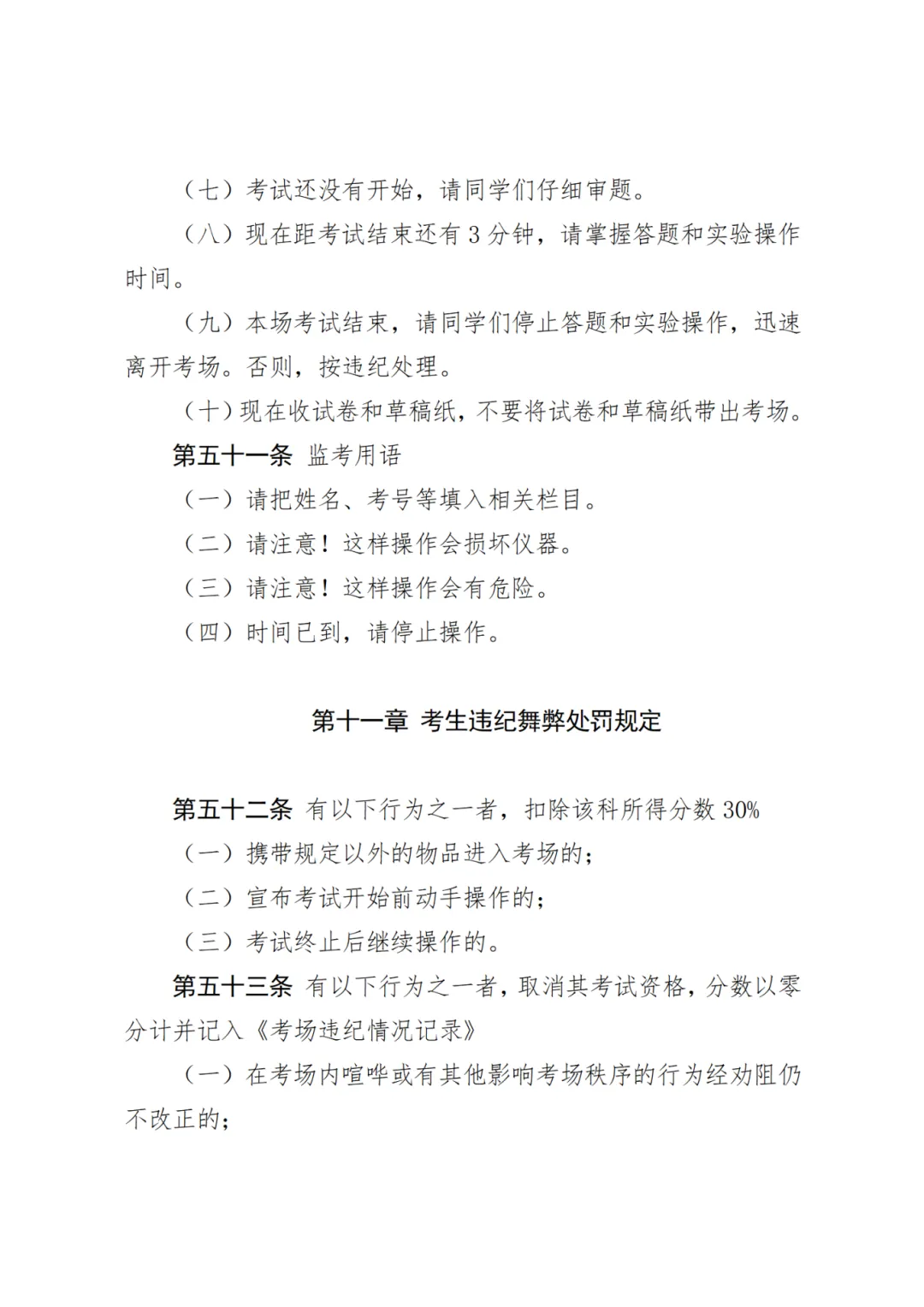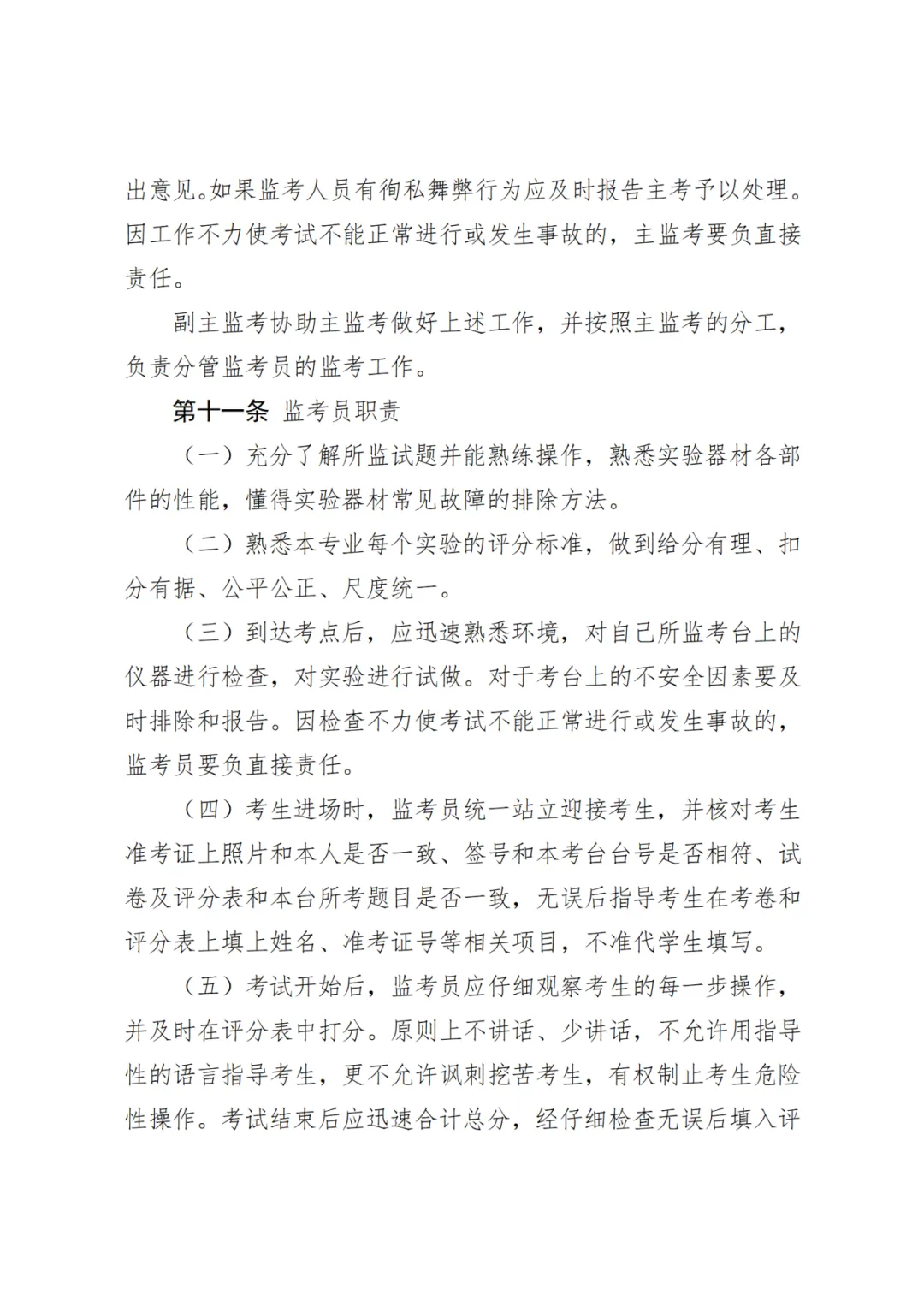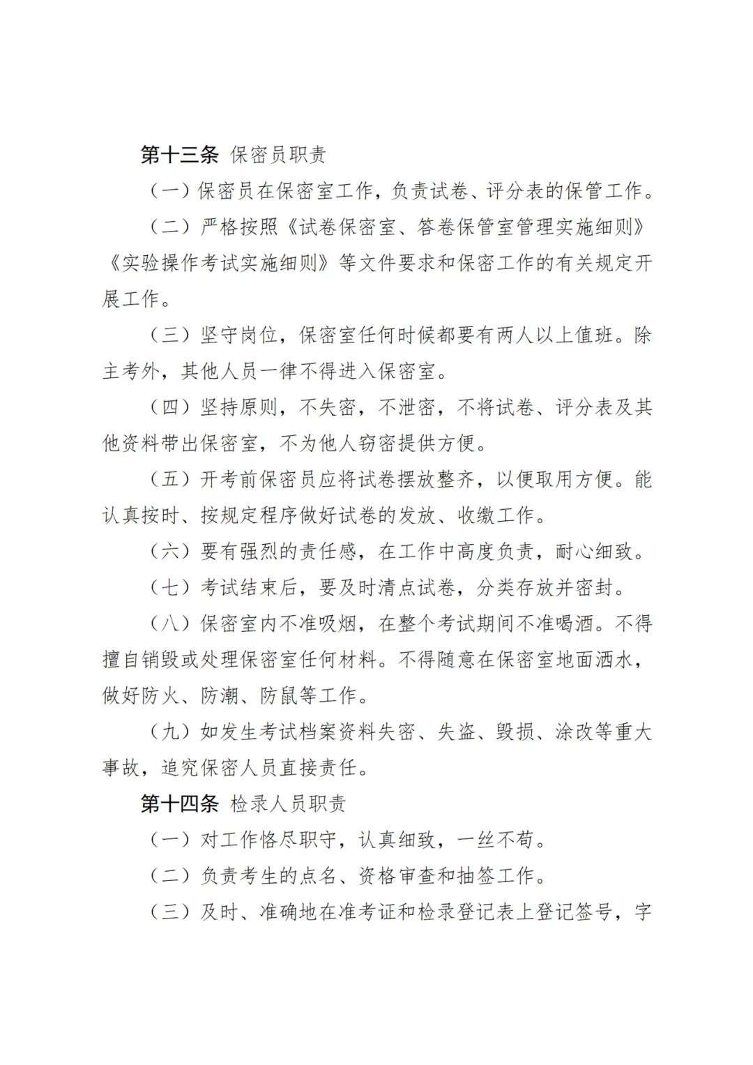 (二)采取措施,公平公正。要加强监考人员的纪律教育,完善监督机制。要加强监考教师的业务培训,使监考教师充分掌握评分标准,做到评分尺度统一,确保监考和评分工作公平、严肃。要严格落实“三固定一调整”(指考场内每个考试实验台实验题目固定、实验器材固定、监考教师固定,每场考试后由监考人员随机调整实验台台签号),严格杜绝各种作弊手段,具备条件的要对考点或考场实行信号屏蔽措施,严防舞弊事件的发生。要严密组织成绩的登分统计工作,要设立专门的保密室,抽调专门人员负责登分统计,切实做到程序严密,相互监督、相互制约。