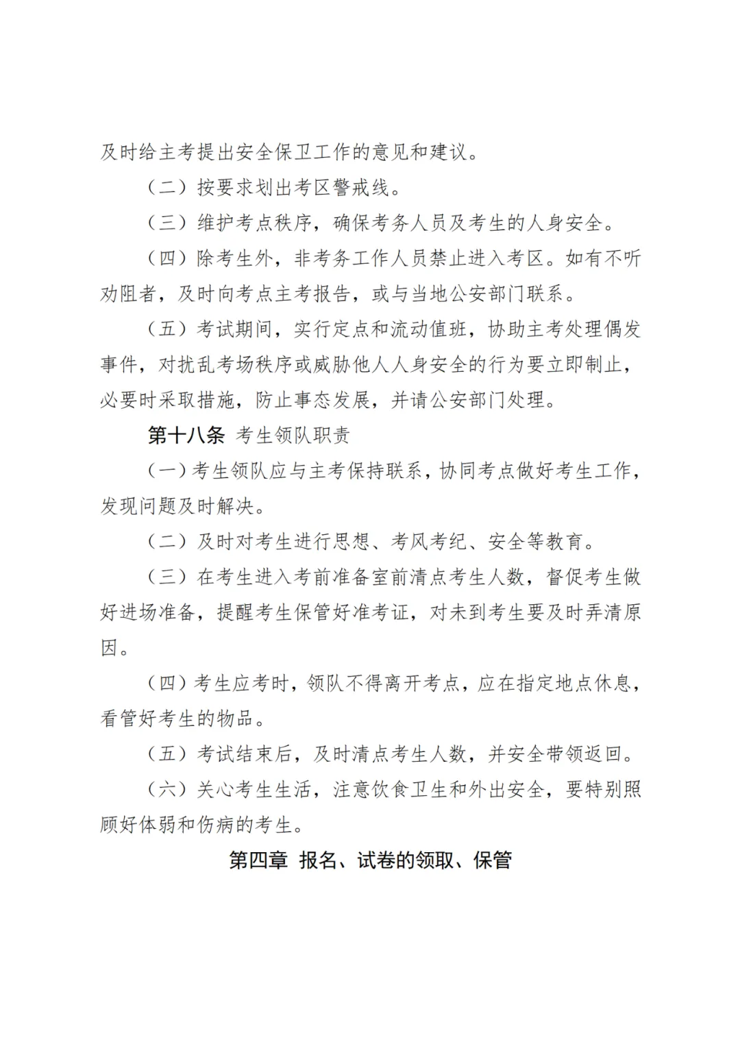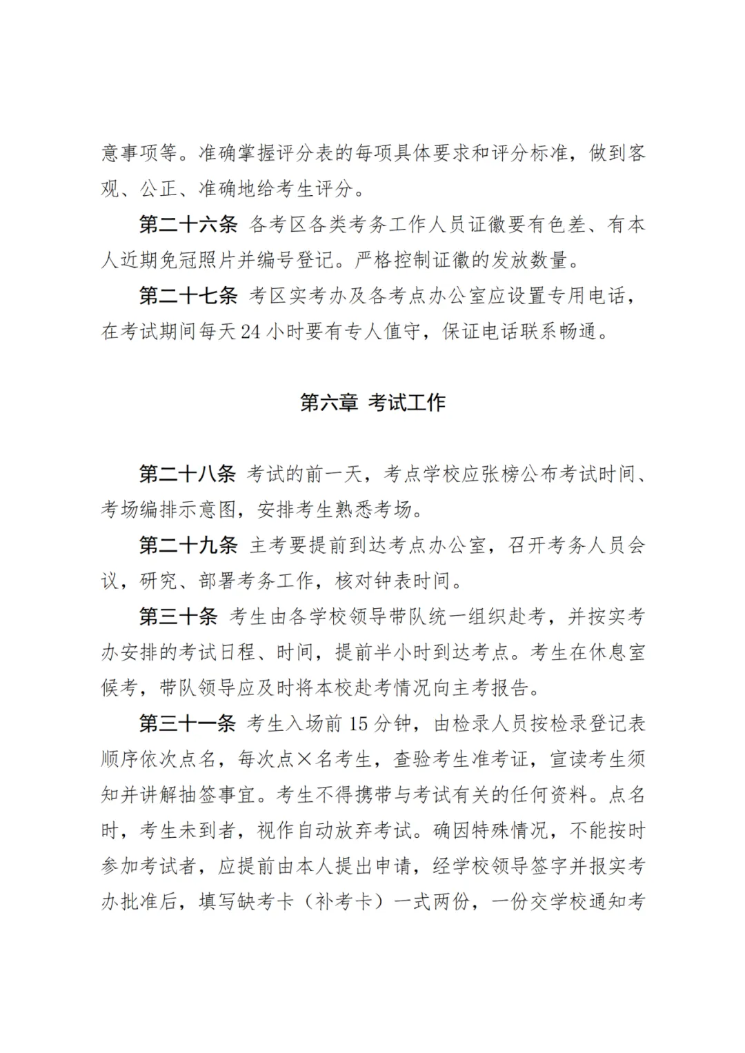 (四)预测预防,确保安全。要保证赴考途中安全。考生如需乘交通工具,所选用的交通工具要符合相关安全要求和标准,严格按照交通工具核载人数运送学生赴考。考生所在学校要切实负起考生赴考过程中的安全责任,各学校需派学校领导担任考试领队,考前对考生进行必要的安全、卫生和考风考纪教育。要保证操作考试的安全。在考试期间,各考点学校要高度重视安全工作,对交通,食宿,实验用电,易燃有毒药品的存放、使用、操作不当可能引发的事故等,都要有防范预案,保证学生、监考教师和工作人员的安全。