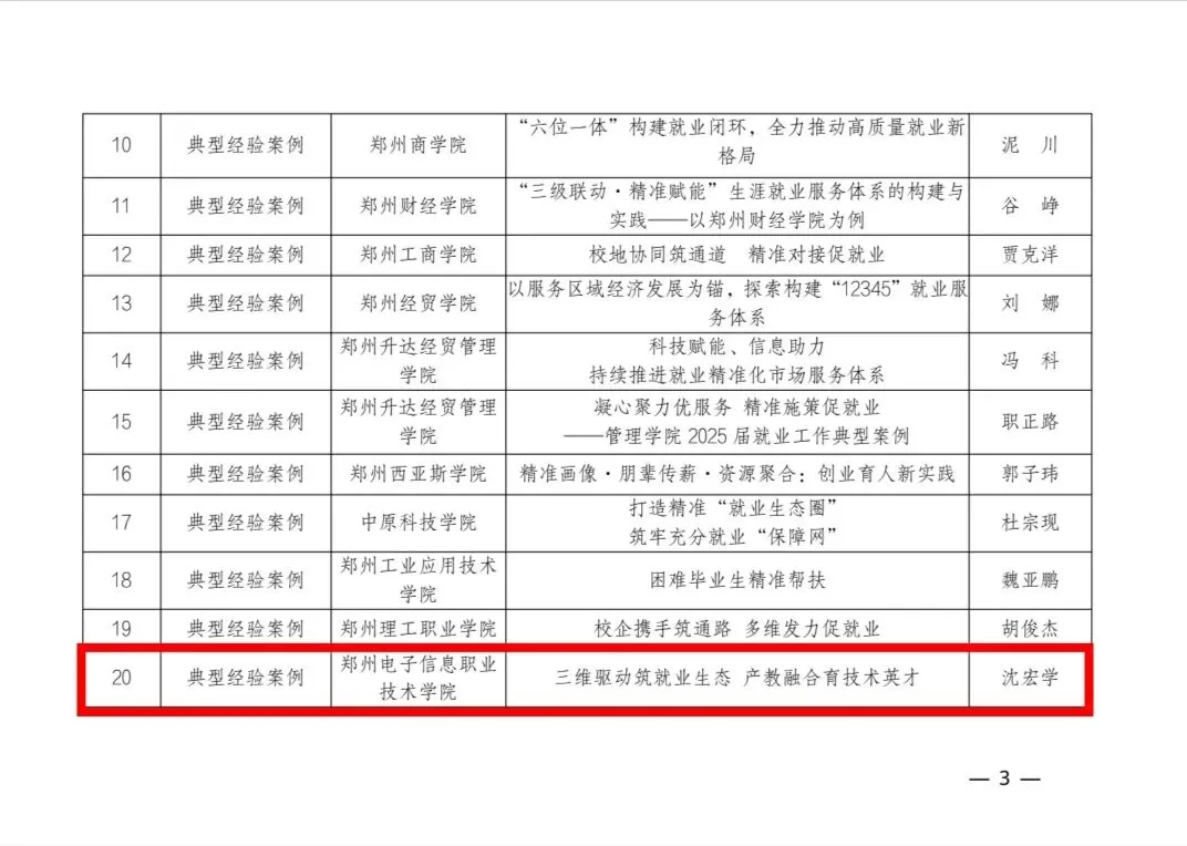 沈宏学老师的《三维驱动筑就业生态 产教融合育技术英才》入选“2025年度郑州地方高校就业工作典型经验案例”;李玲玲老师以《以专业筑梦 用真情导航:“党建+就业”育人模式的创新实践》入选“2025年度郑州地方高校就业工作典型人物案例”。