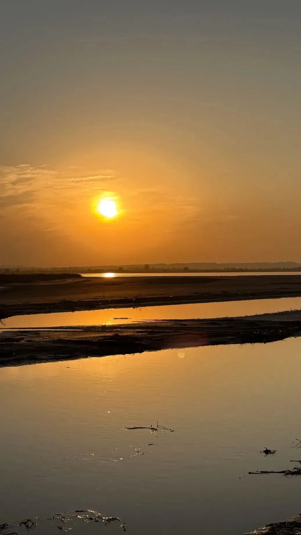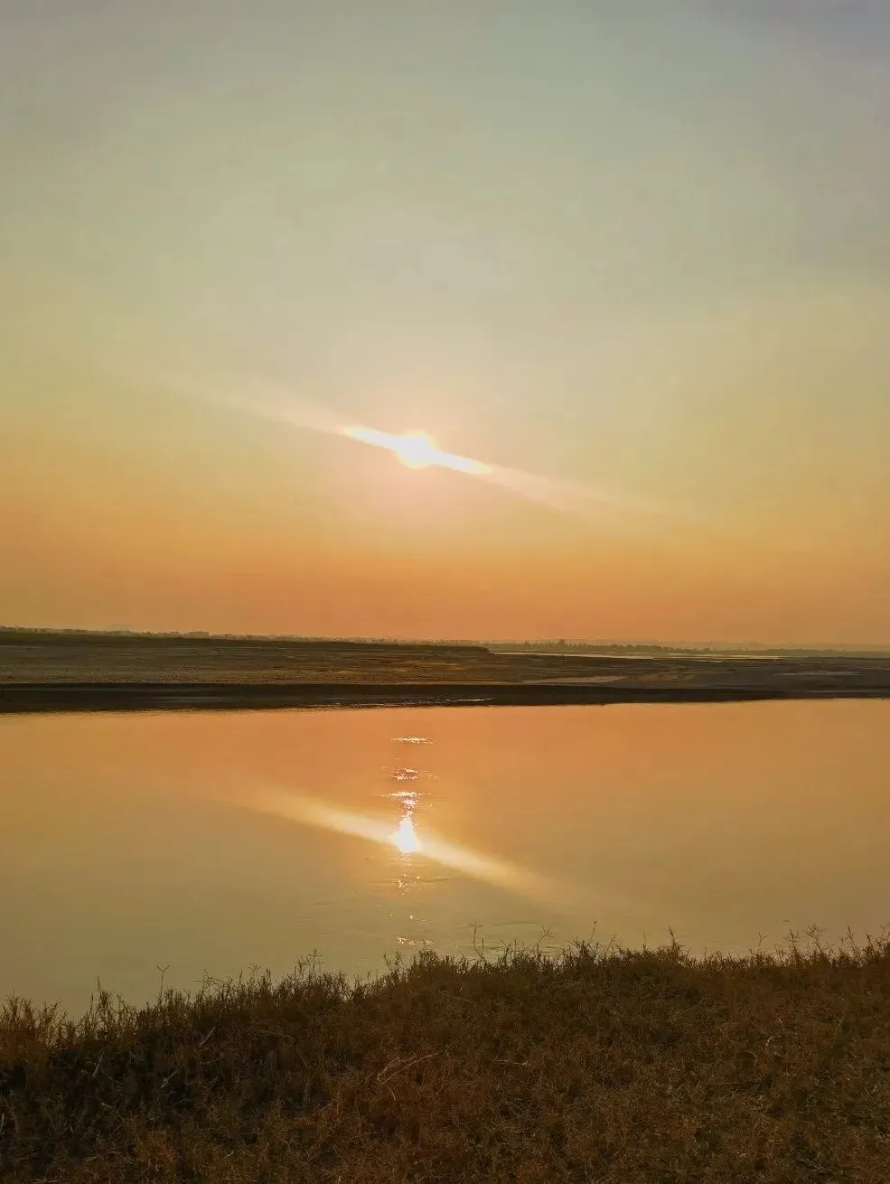 转身之间,又红又大的落日悬在黄河之上,河面洒满碎金,天空从橙黄渐变为粉紫,温柔至极。