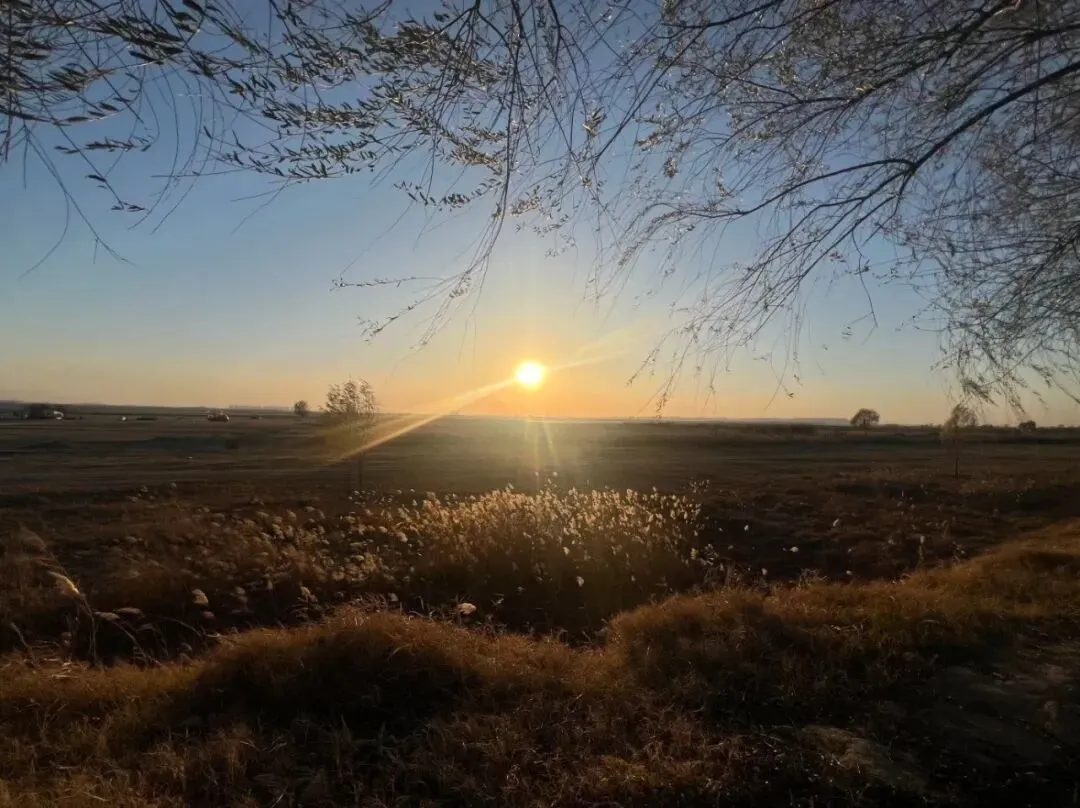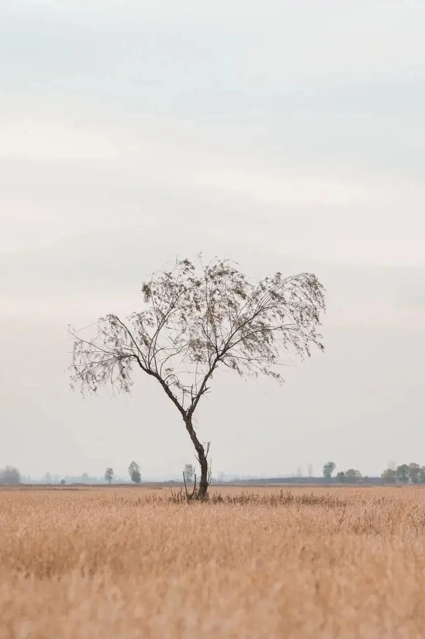 冬季的草原,褪去了绿意,却添了几分近似新疆阿勒泰般的苍茫。风从河面吹来,草色金黄,天地间一棵树静静伫立,在日落时分尤其孤寂而温柔。