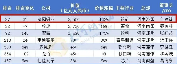 其中,洛阳钼业首次跻身全国前30,成为河南上榜企业领头羊。