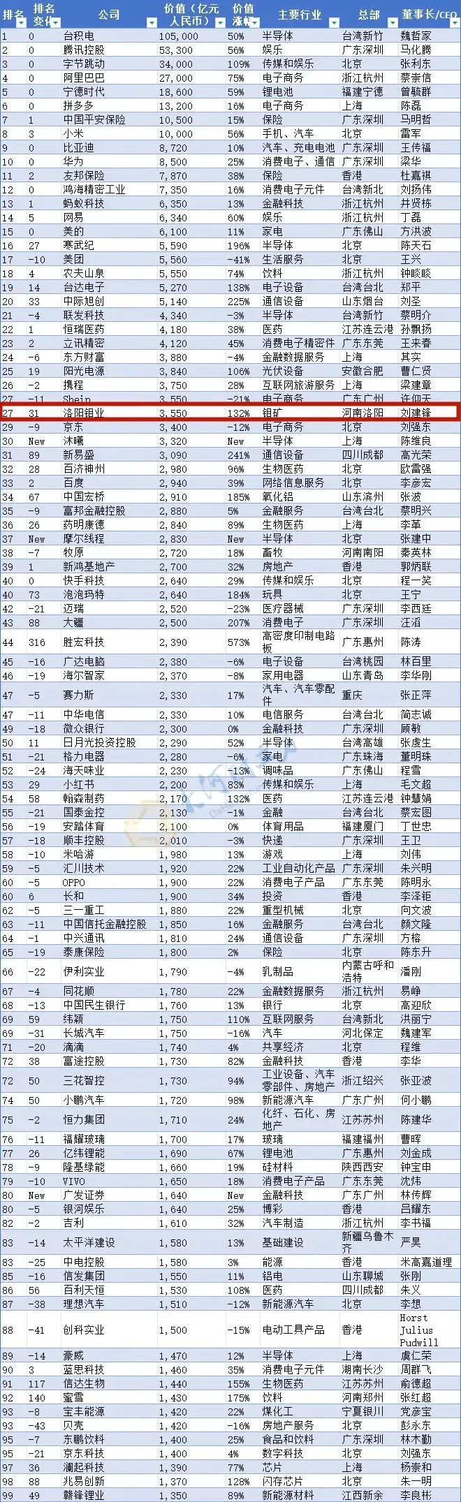 这7家企业分别为洛阳钼业(价值3550亿元,排名27)、牧原(价值2720亿元,排名38)、蜜雪(价值1430亿元,排名92)、宇通客车(价值700亿元,排名213)、多氟多(价值460亿元,排名339)、龙佰(价值450亿元,排名354)、仕佳光子(价值360亿元,排名457)。7家上榜企业总价值9670亿元。