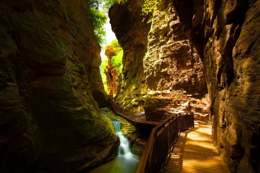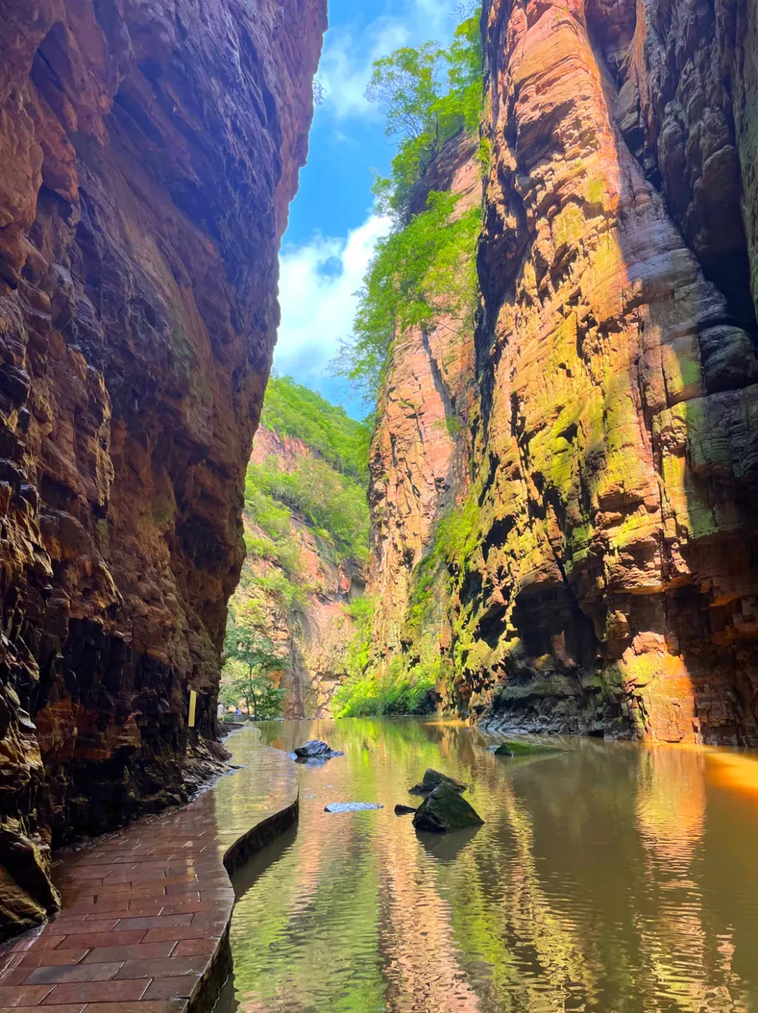 龙潭大峡谷景区位于洛阳新安县北部,是国家5A级景区、世界地质公园,是黛眉山世界地质公园核心景区,是一条以典型的红岩嶂谷群地质地貌景观为主的峡谷景区。