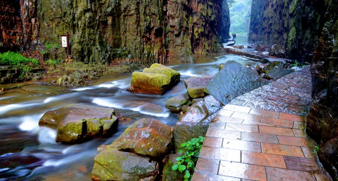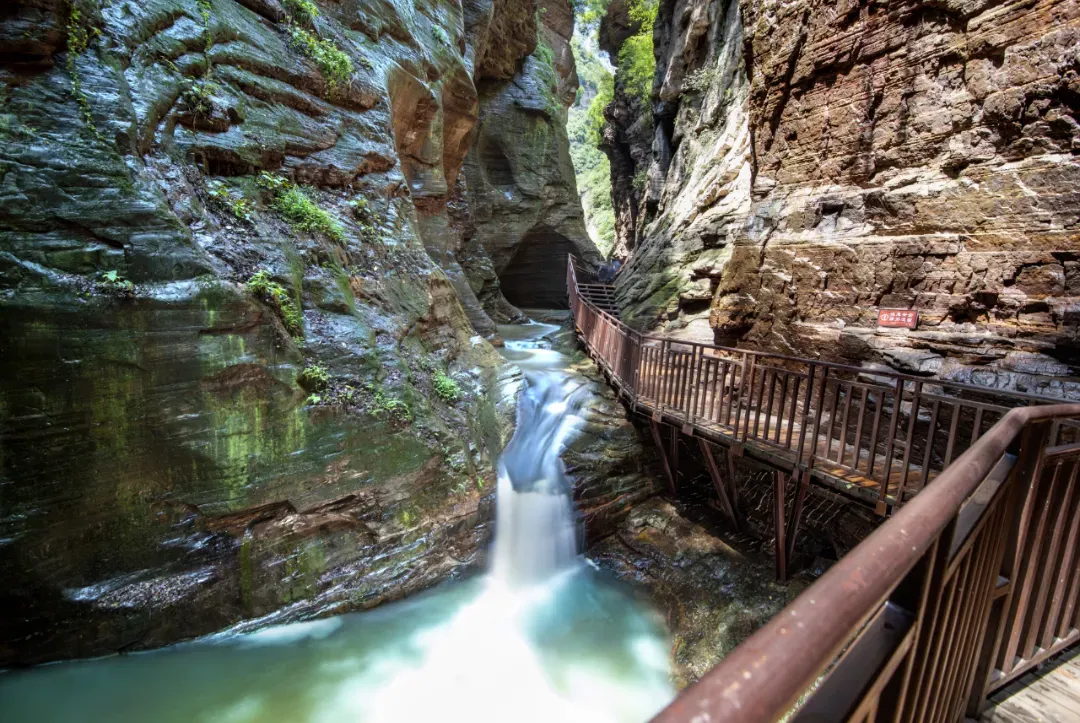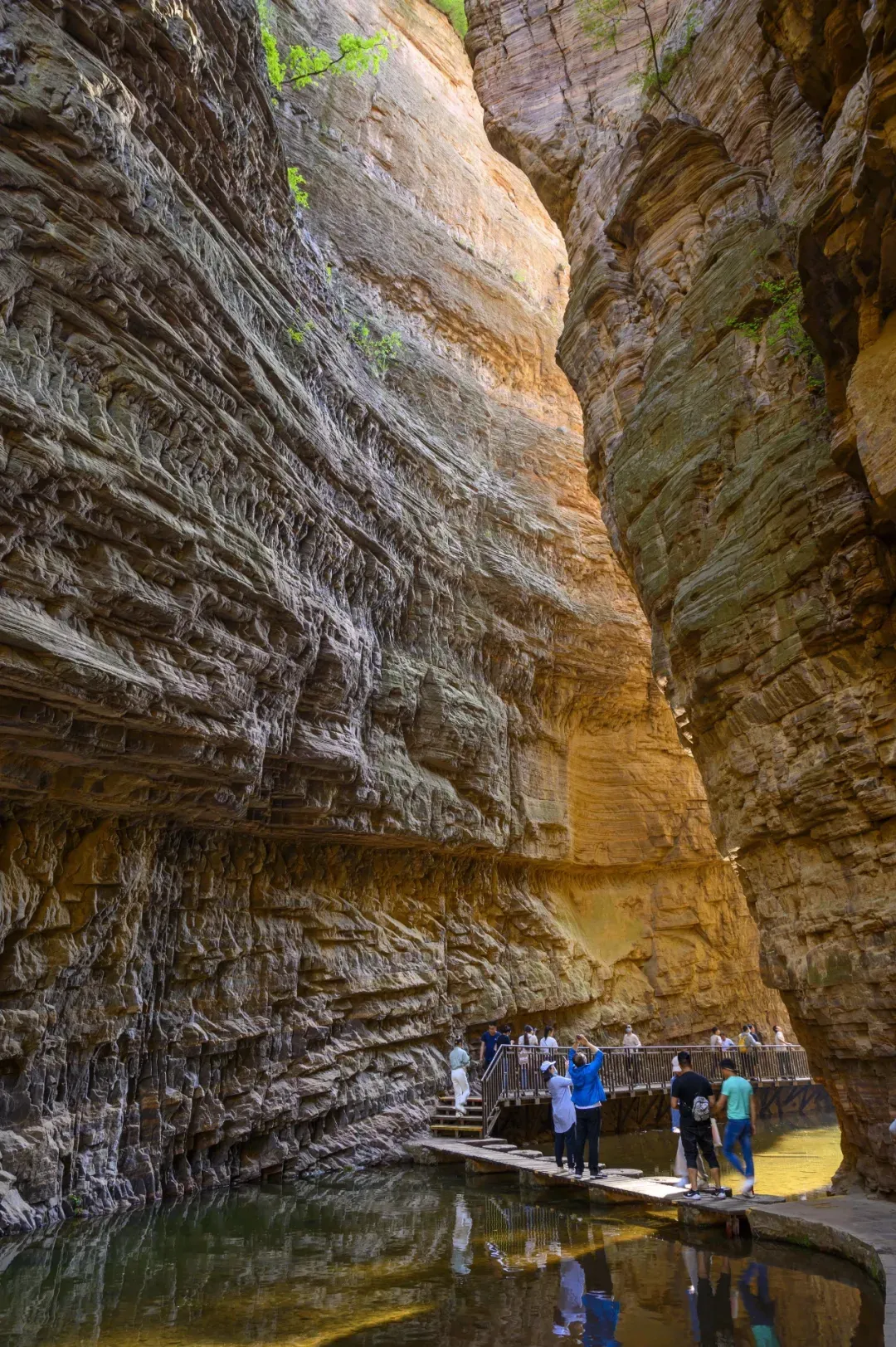 经过五龙潭,走上右侧栈道。栈道较窄,且凌空架设,小编提醒游客朋友们扶好左侧栏杆,注意安全。这一段栈道陡,剩下的都是比较平缓的,走进走进龙门隧道建议大家往中间走,龙门犹如一条时光穿梭隧道,把我们从现实带回到12亿年前的远古时代,穿越这个隧道,就可以欣赏美丽的海滩沉积和壮丽的峡谷奇观。