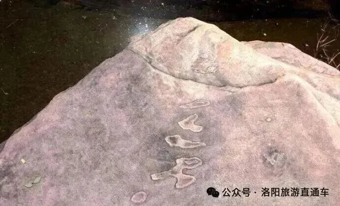 “山不在高,有仙则名”。这块石头上有几个凹坑,就如人的脚印一般,传说是仙人路过此地看到峡谷内的清流下马浴足时留下的。另有一处如马蹄的图案,像是仙人的坐骑留下的。两个脚印同在一块石屏上,相距不足一米,如此巧合,令人遐想。