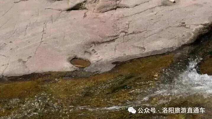 实则:中间的圆形图案是三氧化铁向周边均匀扩散,导致紫红色石英砂岩局部褪色形成的。在龙潭大峡谷中神奇景象随处可见,仙人足迹只是其中的繁星一点。