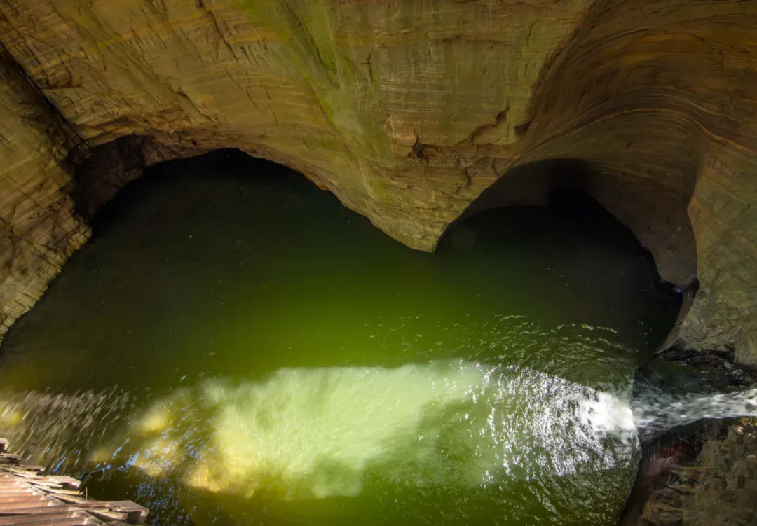 一线天“滴水穿石”贵在水的执着,眼前这个洞再次让我们见证了流水的伟大力量,在绝壁的底部由于水流长期的冲刷旋蚀形成了一个顶部小、肚子大的洞,在地质学上叫石龛。在龙潭大峡谷的阴阳潭上方,就有个形状像瓮的峡谷,称之为“瓮谷”,也叫做壶穴谷。瓮谷也是由流水冲刷旋蚀形成,以阴阳潭处的瓮谷最为典型,直径达20米,弧度270°,经过流水的切割贯通成嶂谷。