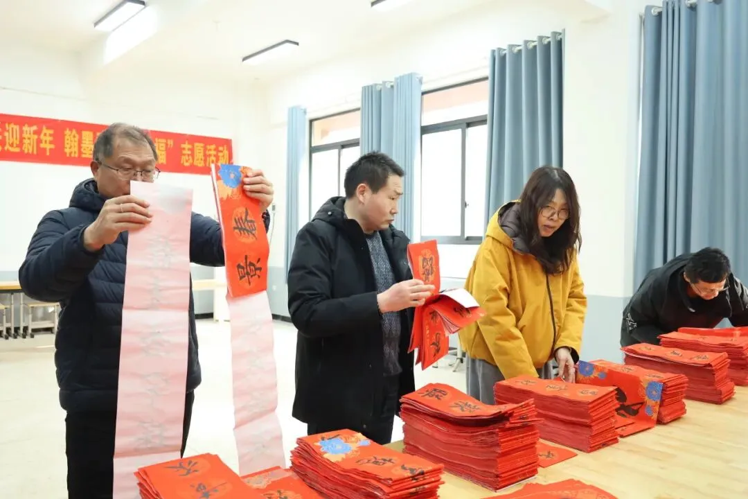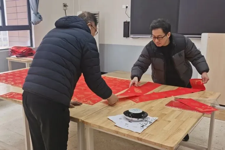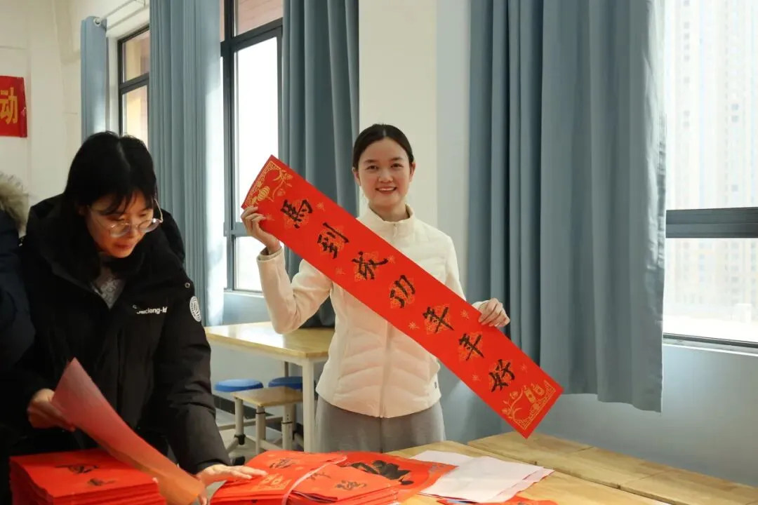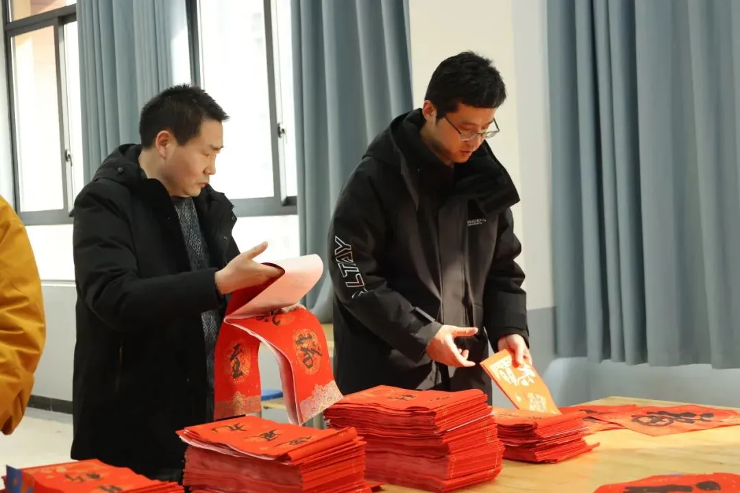 活动现场暖意融融,墨香四溢,几张长桌整齐排布,大红的春联纸色泽鲜亮、喜庆夺目,提前将新春的喜悦洒满校园。