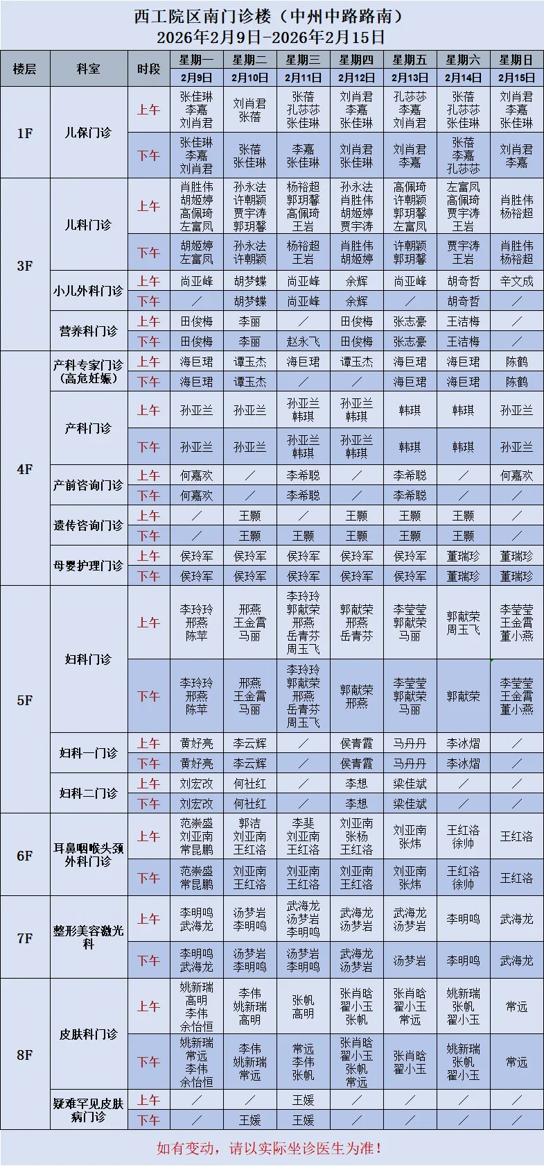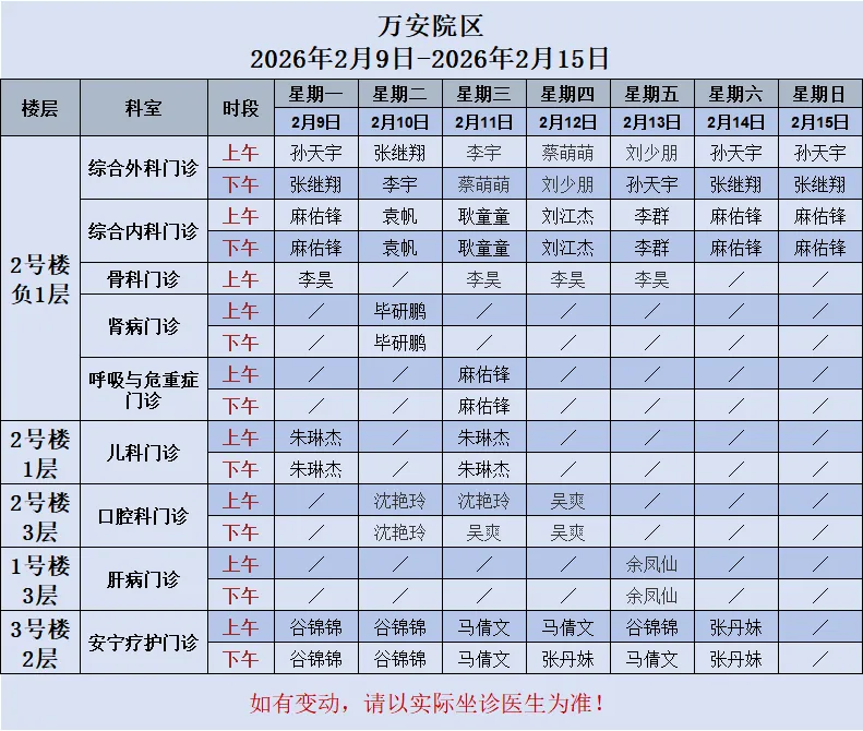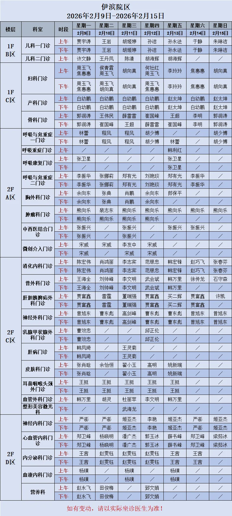 为方便大家合理安排就诊时间,提前规划就医行程,现将我院2026年2月9日至2月15日门诊排班信息进行公示。