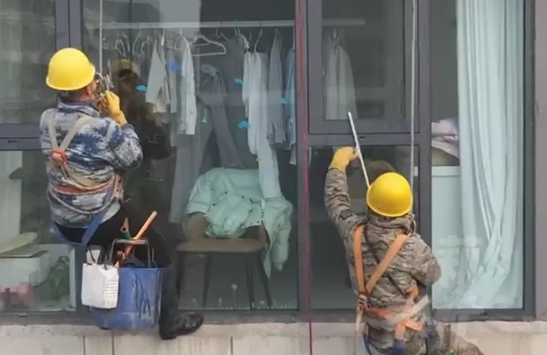2月3日,河南郑州,硬核年底大扫除!郑州一小区年底免费为业主擦外窗玻璃。