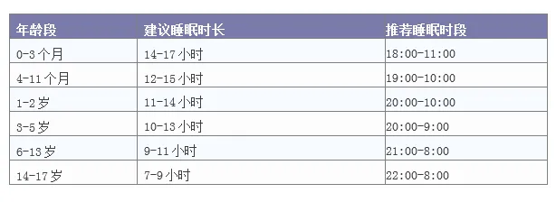 下面是2016年美国睡眠医学会(AASM)发布的《儿童和青少年最佳睡眠时间共识》中推荐的最佳睡眠时间。
