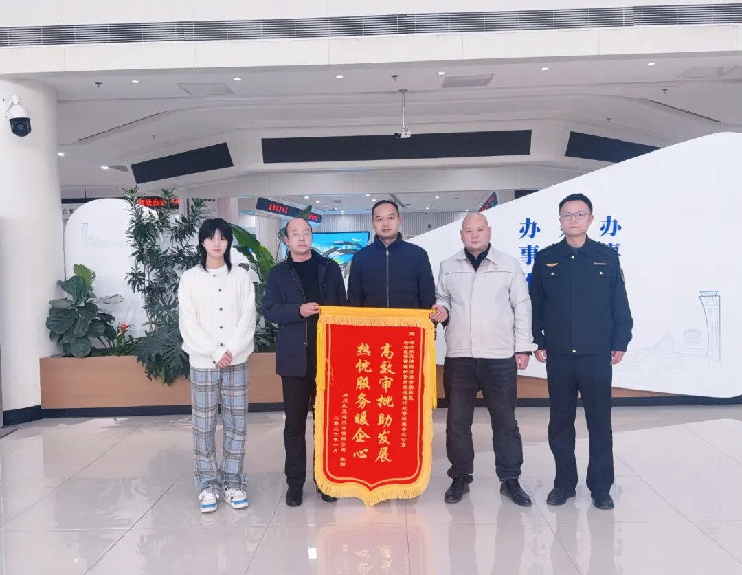 2月5日,郑州比亚迪汽车有限公司将一面印有“高效审批助发展 热忱服务暖企业”的锦旗送至郑州航空港区市场监管和营商环境局行政审批服务办公室,感谢该局自企业在郑州航空港区成立以来,在特种设备相关业务办理中提供的全程热心服务与高效支持。