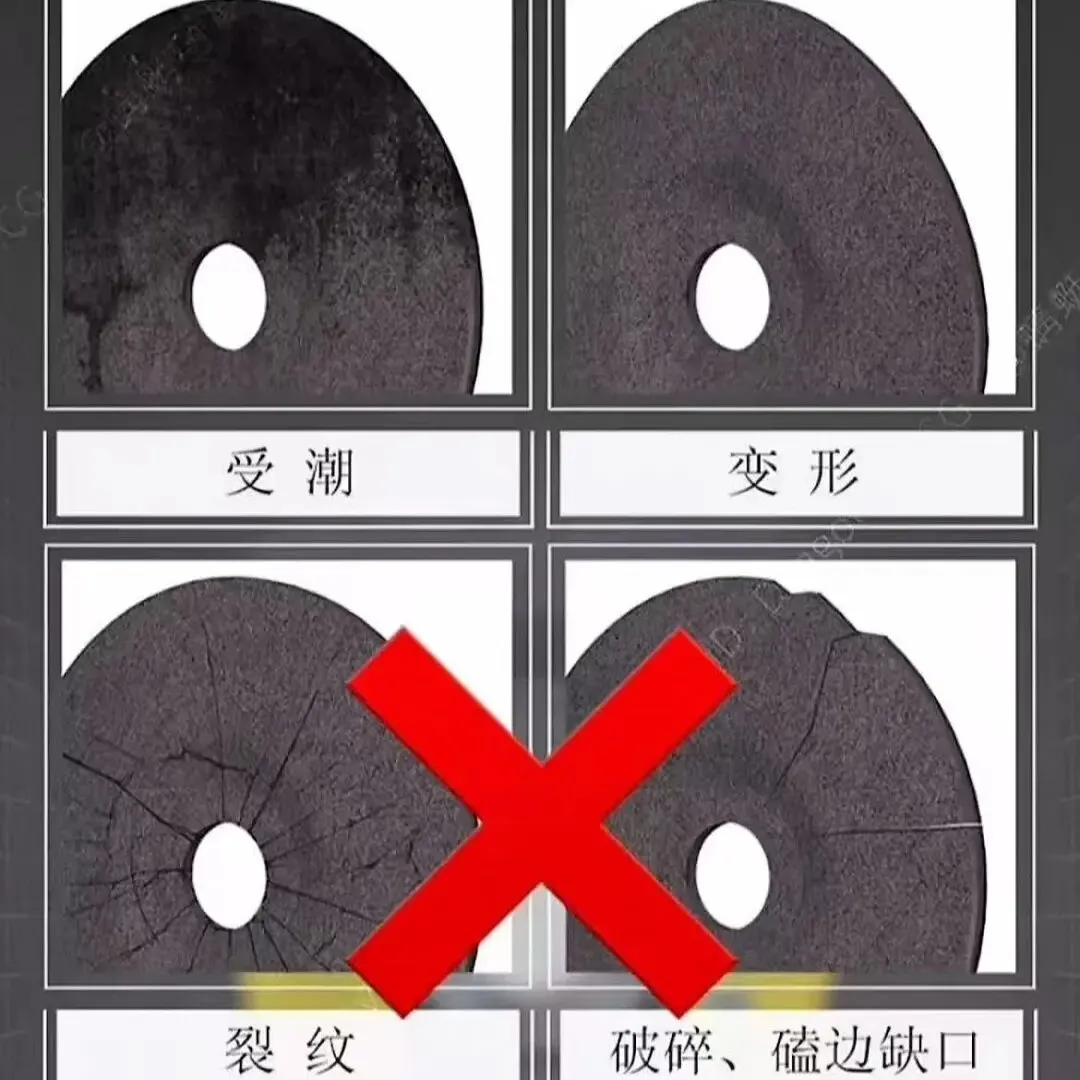 砂轮表面出现径向裂纹、边缘崩缺、掉块、网状裂纹,哪怕是细微发丝裂纹,高速旋转下会存在炸裂风险,属于强制报废更换项,绝对不能凑合使用。