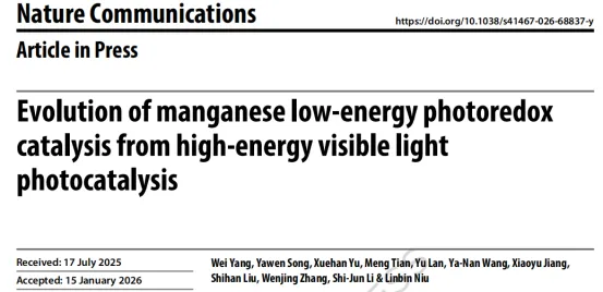 Wei Yang+, Yawen Song+, Xuehan Yu+, Meng Tian, Yu Lan*, Ya-Nan Wang, Xiaoyu Jiang, Shihan Liu, Wenjing Zhang*, Shi-Jun Li*, and Linbin Niu*. Evolution of manganese low-energy photoredox catalysis from high-energyvisible light photocatalysis.Nat. Commun.2026, doi: 10.1038/s41467-026-68837-y.