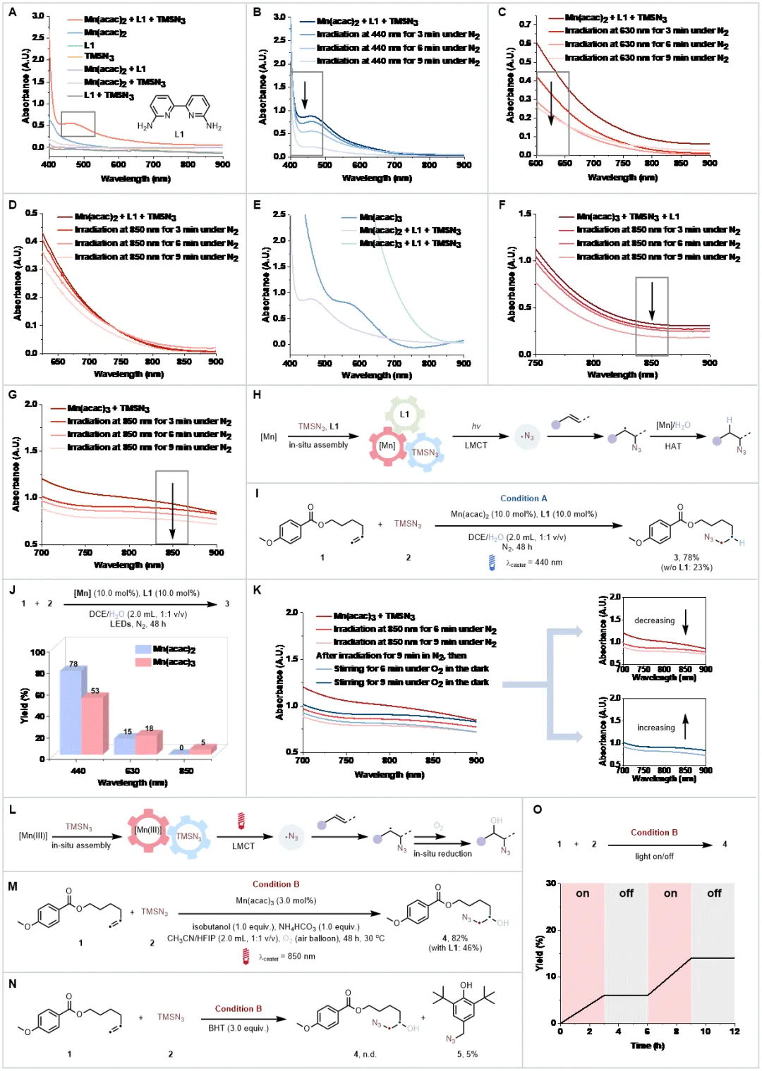 Mn(acac)₂与配体、TMSN₃原位组装形成的体系在 475 nm 处出现强吸收峰,且吸收尾端延伸至低能量区域,在440nm的蓝光照射下该吸收峰快速衰减,而在630nm和850 nm低能量光照射下,该体系虽能被消耗但效率显著降低,原因可能是其在700-850 nm区域吸光较弱;将锰价态提升至+3(采用Mn(acac)3)后,体系在700-850 nm低能量区的吸光强度显著增强,且在850 nm近红外光照射下吸光度会明显下降。进一步的研究发现,配体对近红外光吸收并非必需;以反马氏加氢叠氮化为模型反应,Mn(II)体系在440 nm蓝光下实现78%的产率,H2O经D₂O替代实验证实为氢源。而Mn(III)体系在该反应中因无外部氧化剂时难以再生导致产率极低;引入绿色氧化剂O2后,Mn(III)体系可顺利再生,结合异丁醇作为还原剂,在850 nm低能量光下一步实现烯烃的羟基叠氮化,目标产物产率达82%,自由基捕获实验(BHT)证实叠氮自由基是关键中间体,开关实验则排除了自由基链式反应路径。