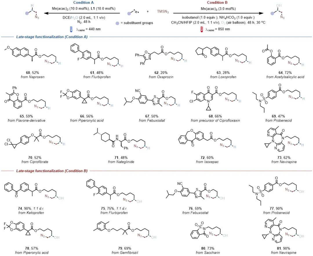 两种原位组装体系均能成功对多种含复杂分子骨架的药物烯烃进行修饰,生成复杂烷基叠氮化物,产率介于20%-90%之间,且低能量光催化体系生成的产物同时含有叠氮与羟基官能团,为生物医药研究提供了新的分子靶点,进一步验证了体系在药物研发领域的实用价值。