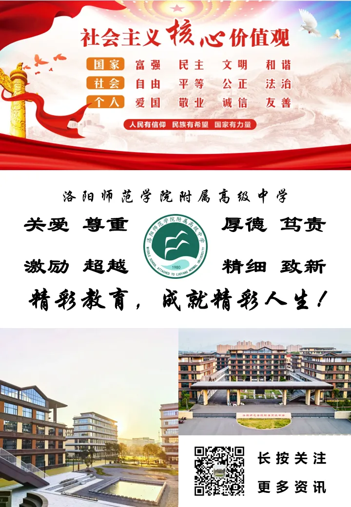 最后,洛阳师范学院附属高级中学全体教职工恭祝各位同学,学业有成,健康成长;恭祝各位家长朋友们,工作顺利,身体健康;恭祝所有关心师院附中事业发展的各界人士,新春快乐,幸福美满,阖家欢乐!