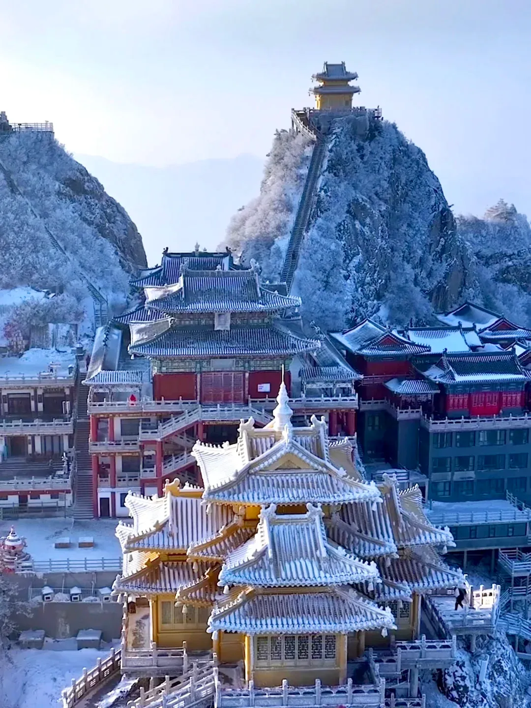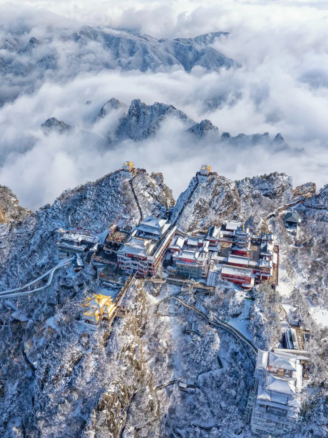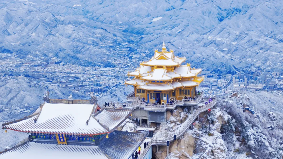 当一场春雪或冬雪降临,玉皇顶、亮宝台等殿宇的金色琉璃瓦上,便堆积起皑皑白雪。阳光穿透云层洒下,金光与雪色交相辉映,璀璨却不刺眼,庄严肃穆中平添了几分奇幻与温柔,宛若“云上仙宫”。