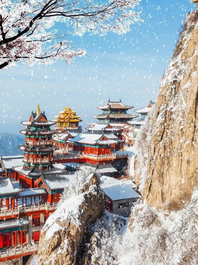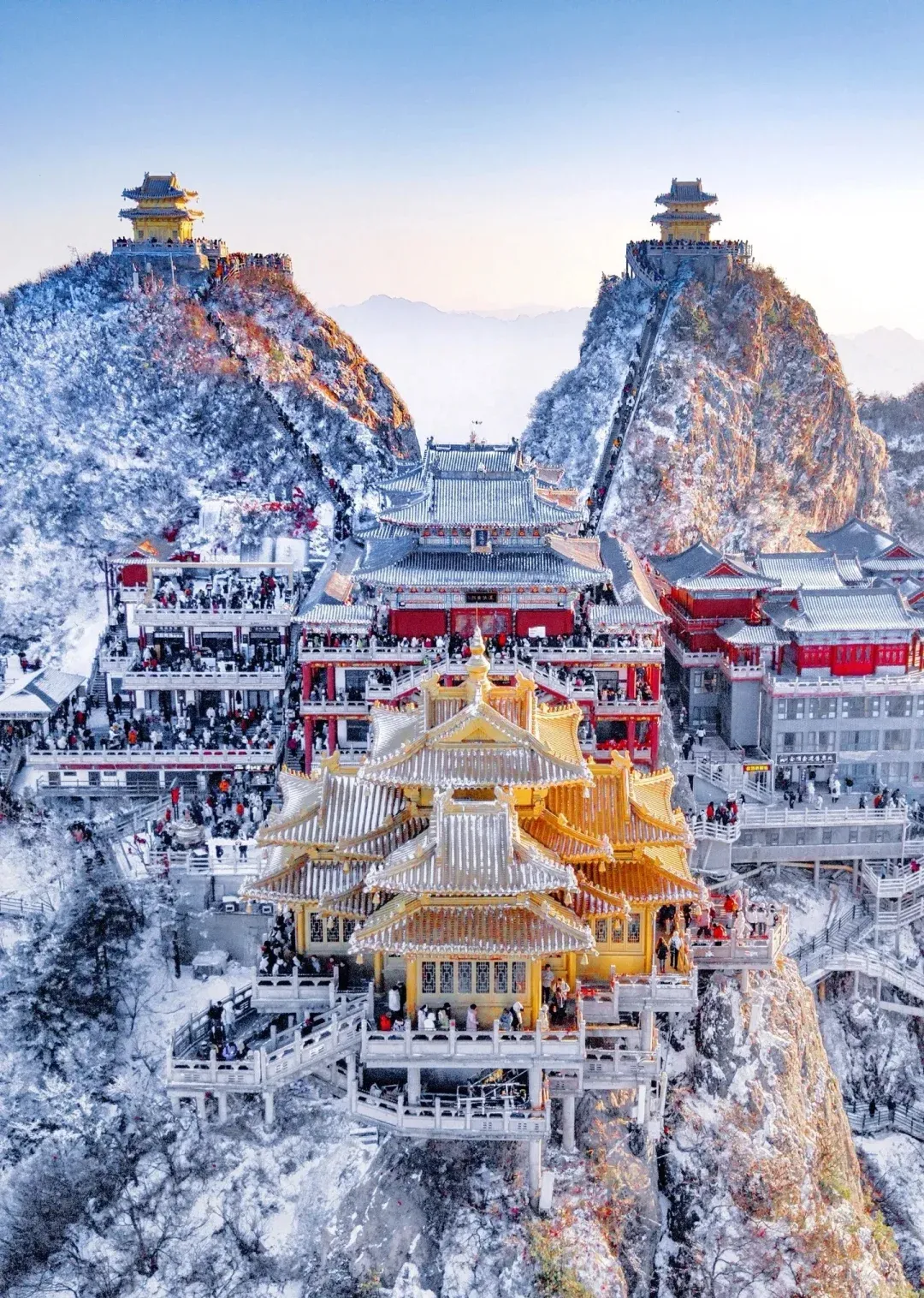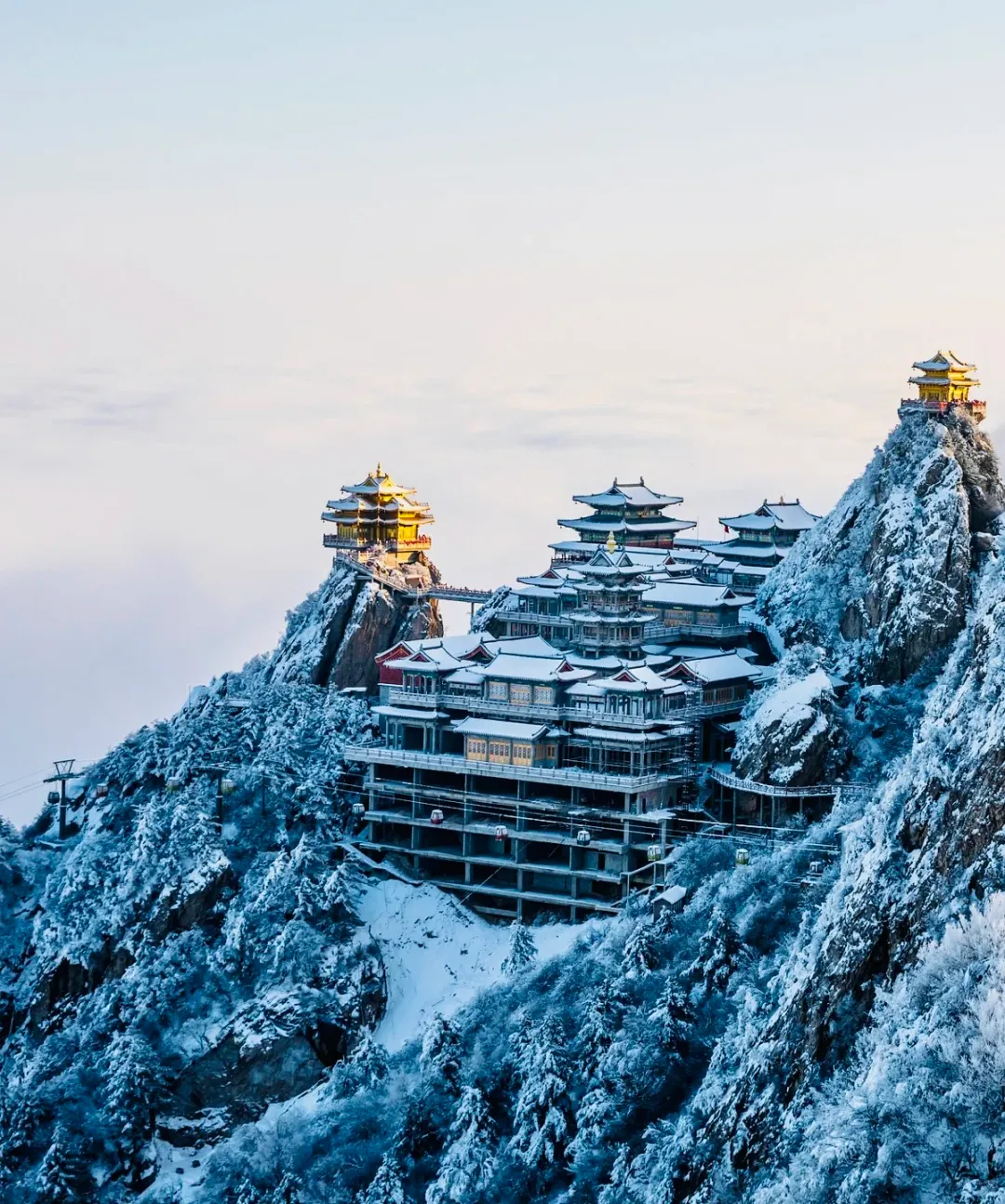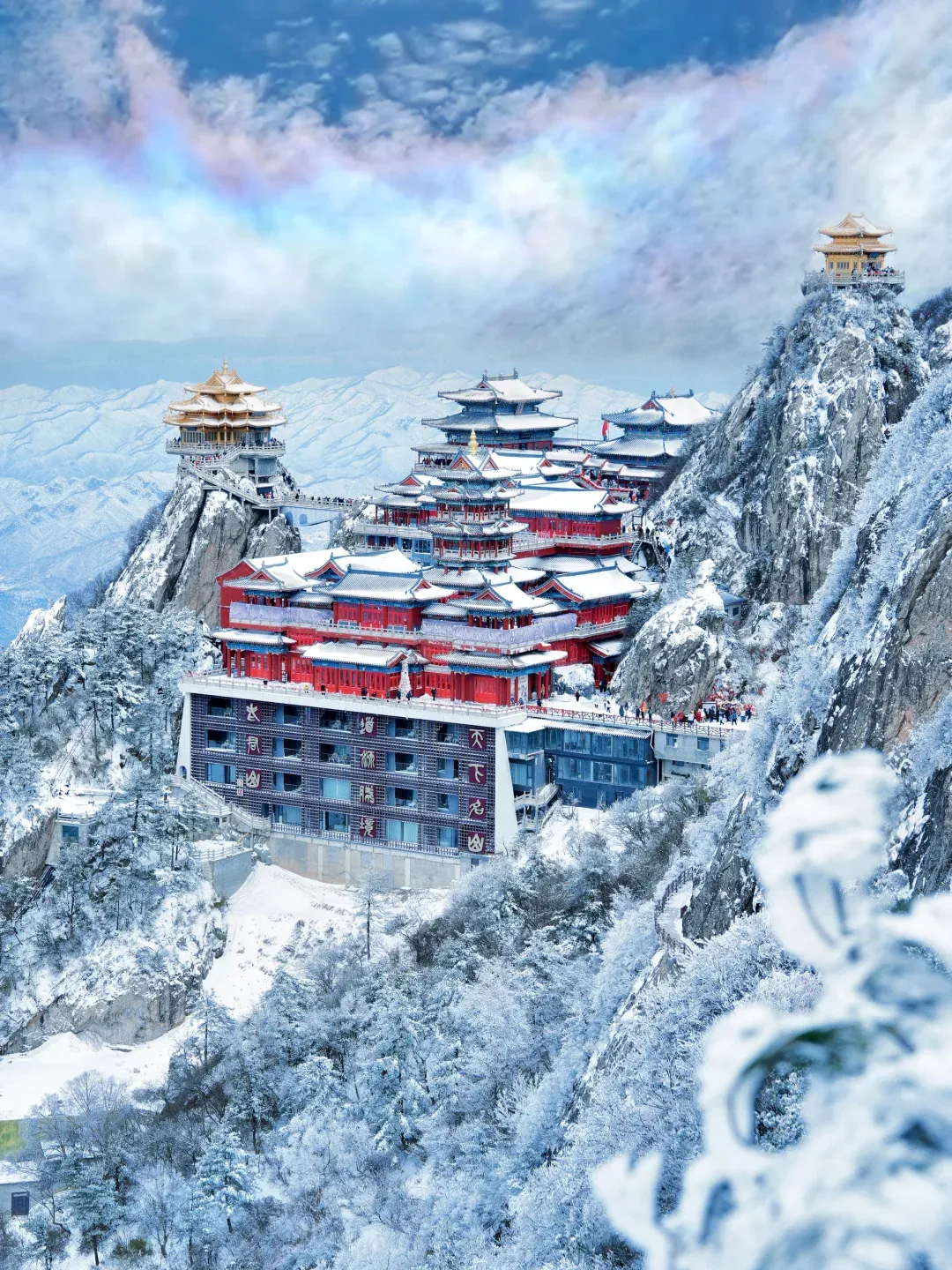 当一场春雪或冬雪降临,玉皇顶、亮宝台等殿宇的金色琉璃瓦上,便堆积起皑皑白雪。阳光穿透云层洒下,金光与雪色交相辉映,璀璨却不刺眼,庄严肃穆中平添了几分奇幻与温柔,宛若“云上仙宫”。