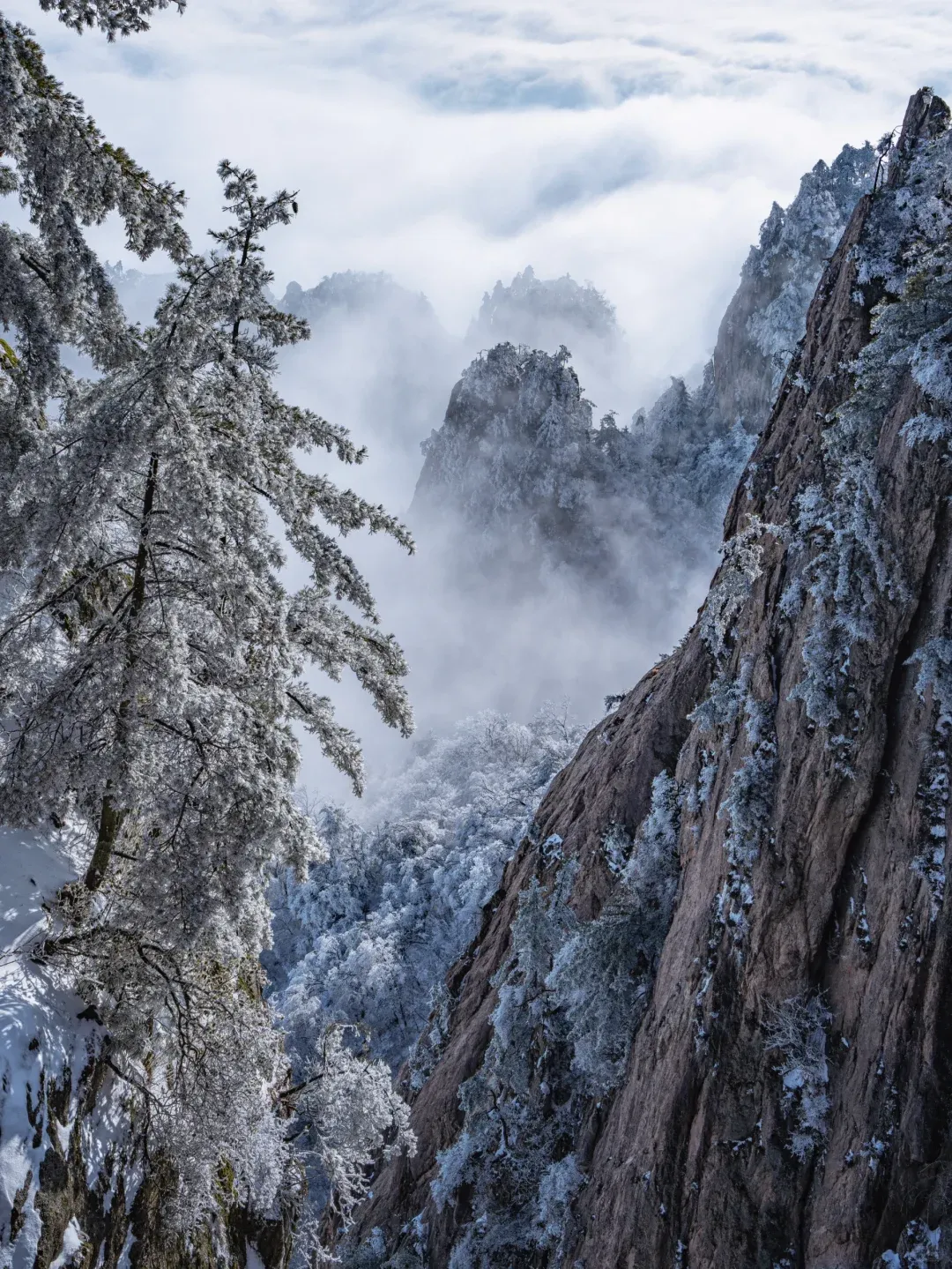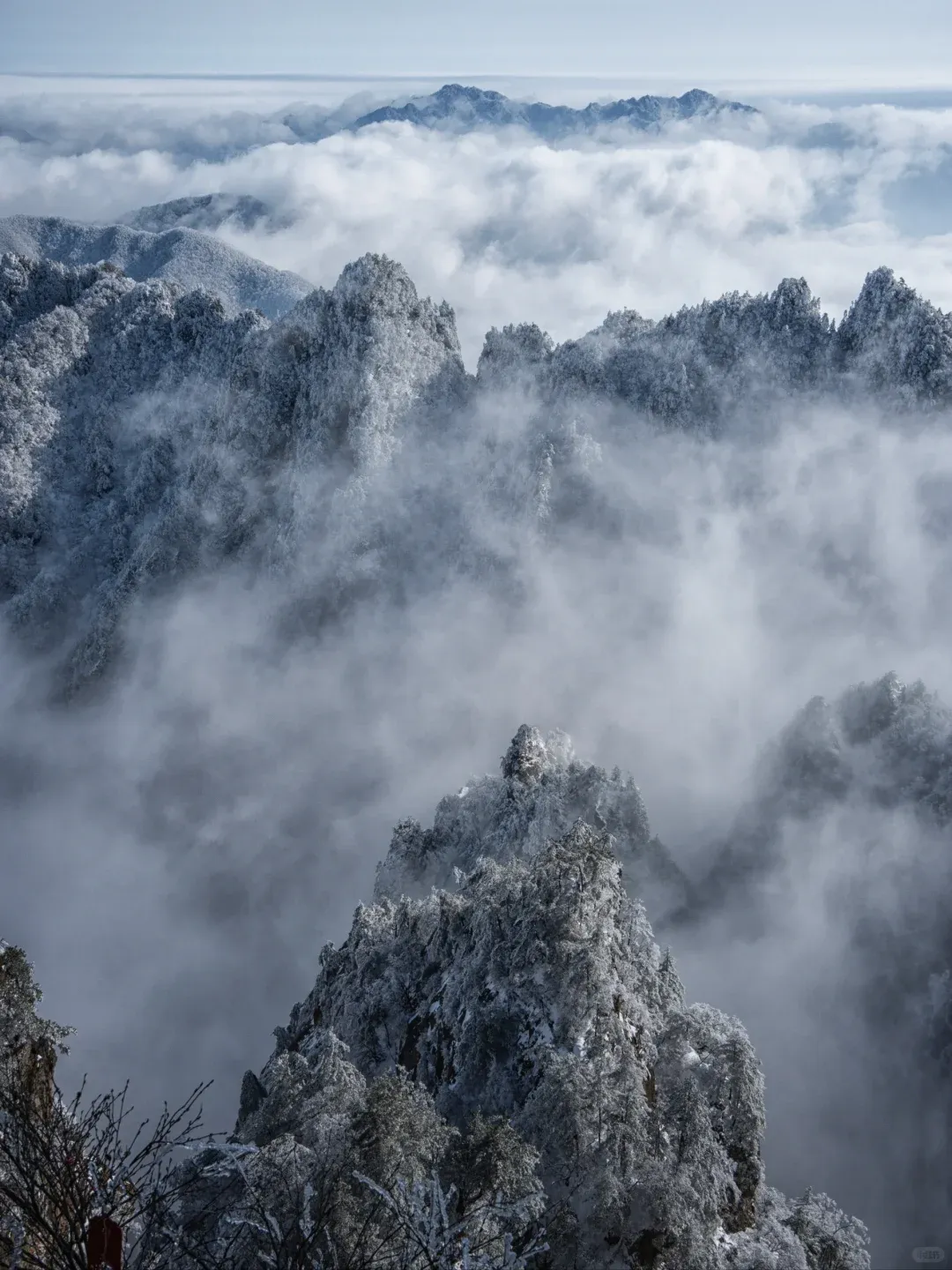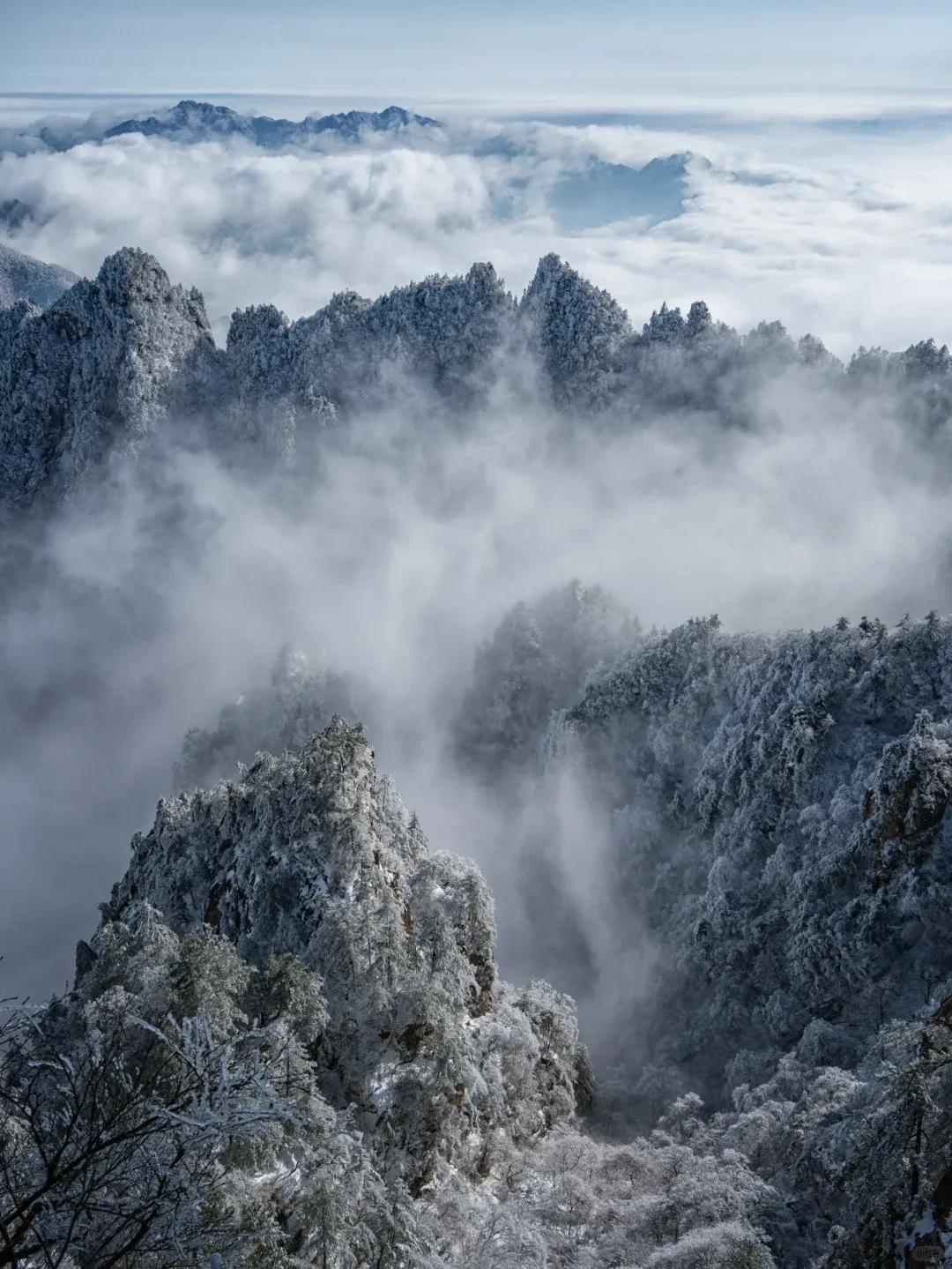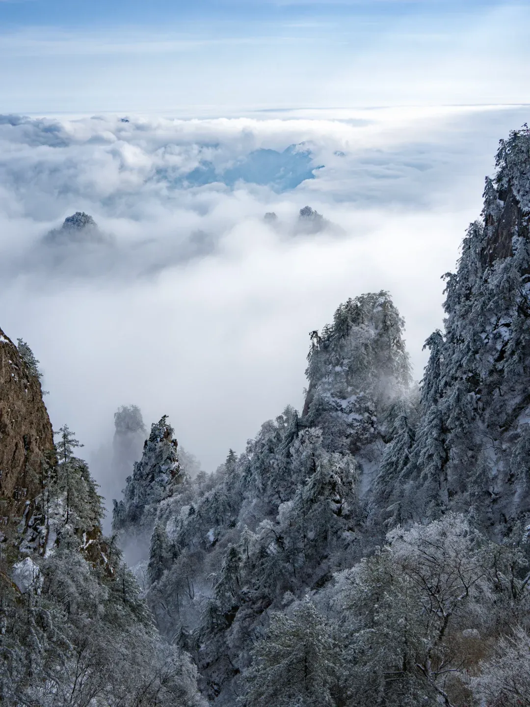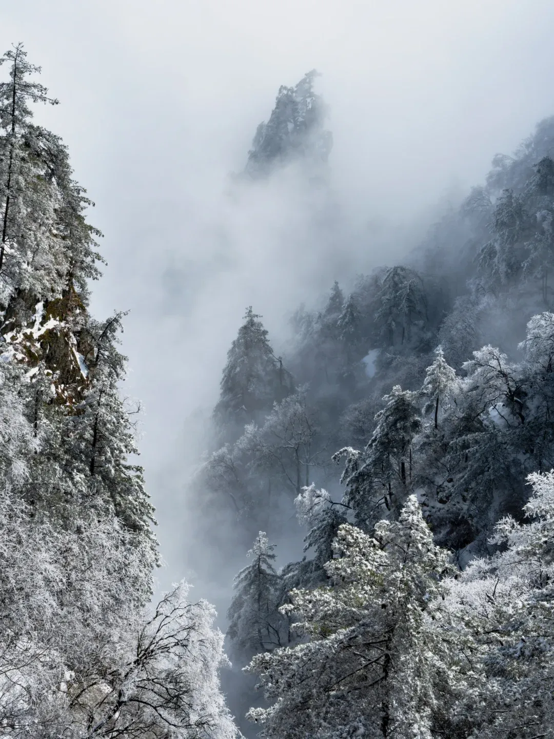 雪后初霁的老君山,是一场关于白色与意境的交响。举目望去,群山“银装素裹”,万树“玉树琼花”。原本苍翠的峰峦与深赭的绝壁,被蓬松而厚实的白雪温柔覆盖,轮廓变得圆润而梦幻。