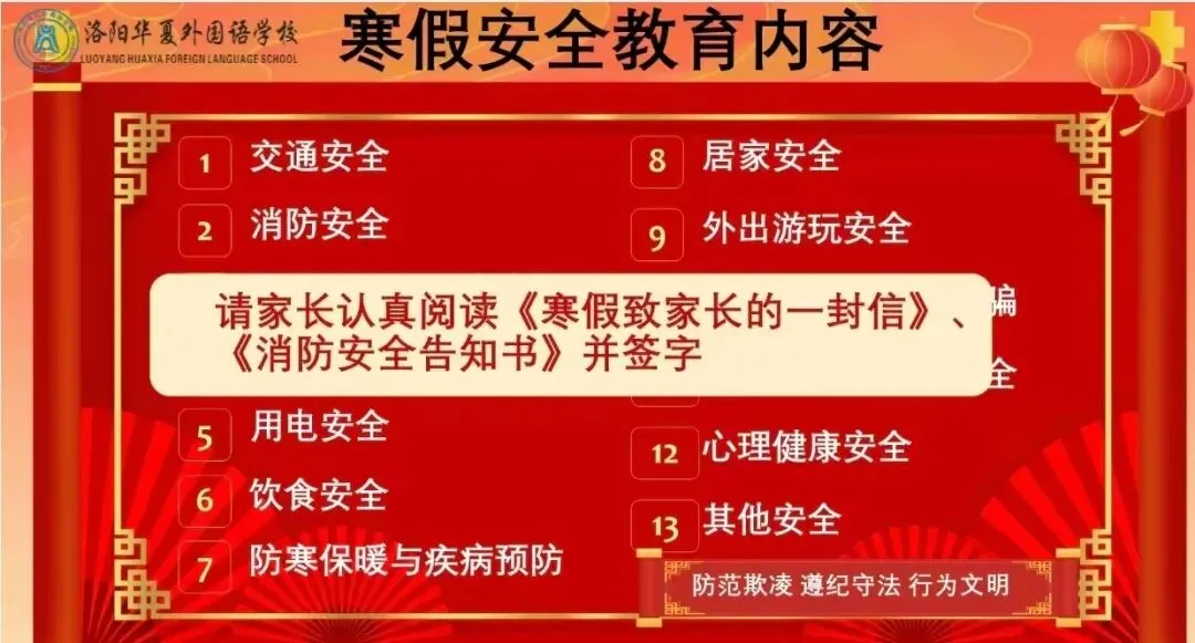 安全无小事,预防是关键。班主任对消防安全、交通安全、防走失、防诈骗等安全问题进行强调。家长阅读《寒假致学生家长的一封信》、《寒假消防安全教育家长告知书》并签字,共同为孩子假期安全保驾护航。