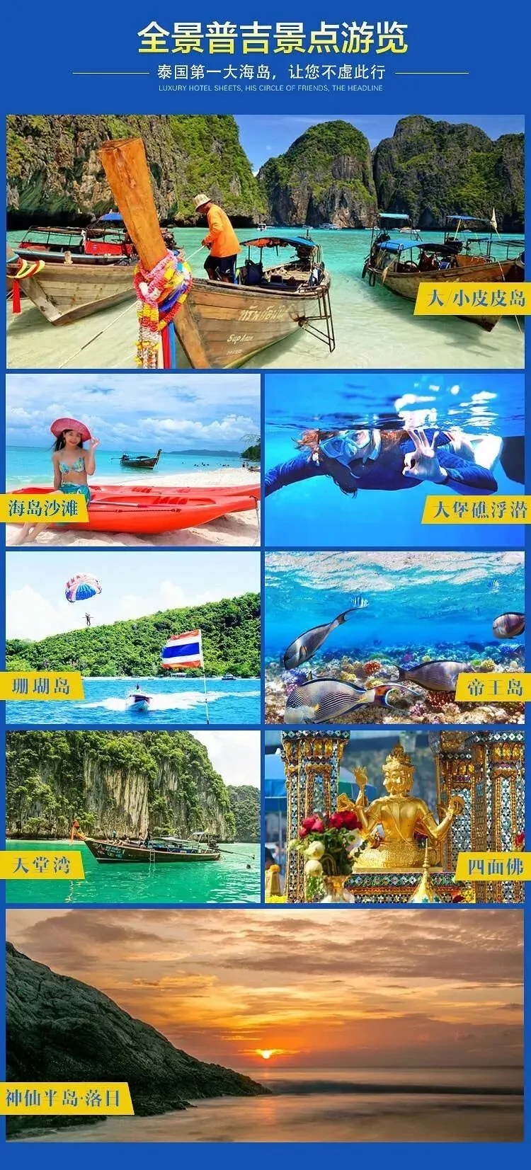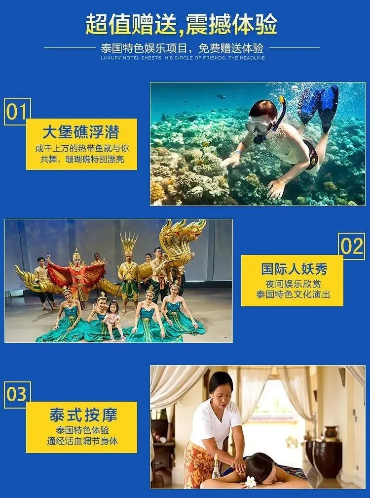 今天首先探访【蓝钻岛】『2h』。蓝钻岛面积约1平方公里,地处泰国国家一级珊瑚保护区内,四周海域是浮潜和潜水爱好者必去之地。岛上大致划分为三个海滩区域,主沙滩的沙子质量最好,沙滩躺椅大部分集中于此;珊瑚礁石滩是快艇登陆之处,珊瑚石较多,触感比较轧脚,以海上项目为主;岛上最引人入胜的是岩石滩,因为在这里不用浮潜、不用游泳,站在浅水处就可以很清晰地看到热带鱼群。不过提醒大家,在此浅水处观鱼最好穿上拖鞋,因海沙与岩礁混合,不小心踩到石头容易受伤,到时候“血染蓝钻岛”就容易引来小鲨鱼哦!(小鲨鱼不咬人很可爱)。国家级珊瑚保护区内的热带鱼较多,只要你下到海中,它们就围拢上来环绕在你的周围,轻轻叮咬你的手臂或身体,给你来次水下按摩。另外保护区内童话般的珊瑚世界也在等待你【浮潜】探索。岛上另备有运动设施沙滩排球、足球、扑克牌、麻将、救生衣、浮潜、沙滩躺椅等各类活动,游客皆可使用。大家记住蓝钻岛英文名Koh Khai Nai 防止假冒。团友们若有兴趣参与更为惊险刺激的海上项目,可咨询当地导游。【闲情下午茶】“海景发呆亭”享用闲情下午茶,建议大家带上墨镜,与这样一位蓝色妖姬整天相伴,可不要变“蓝色盲”了哦!……请大家记住蓝钻岛英文名Koh Khai Nai 防止假冒。晚上我们返回普吉本岛。