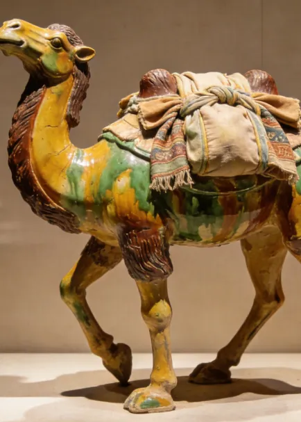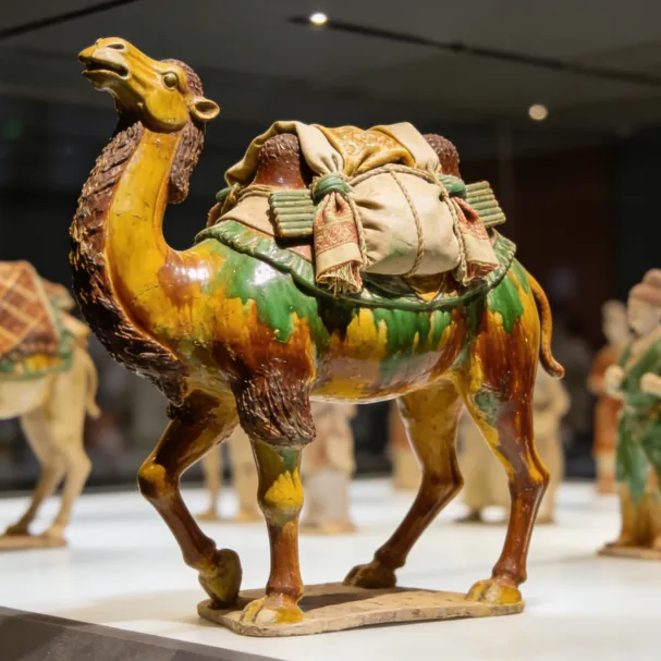 另一侧陈列的唐代三彩骆驼俑,则散发着丝绸之路的异域风情。骆驼昂首阔步,背上驮满丝绸包裹,釉色斑斓绚丽,黄绿褐交织,生动还原了商队往来长安的盛况。细节刻画细腻,彰显唐代开放包容的气度。