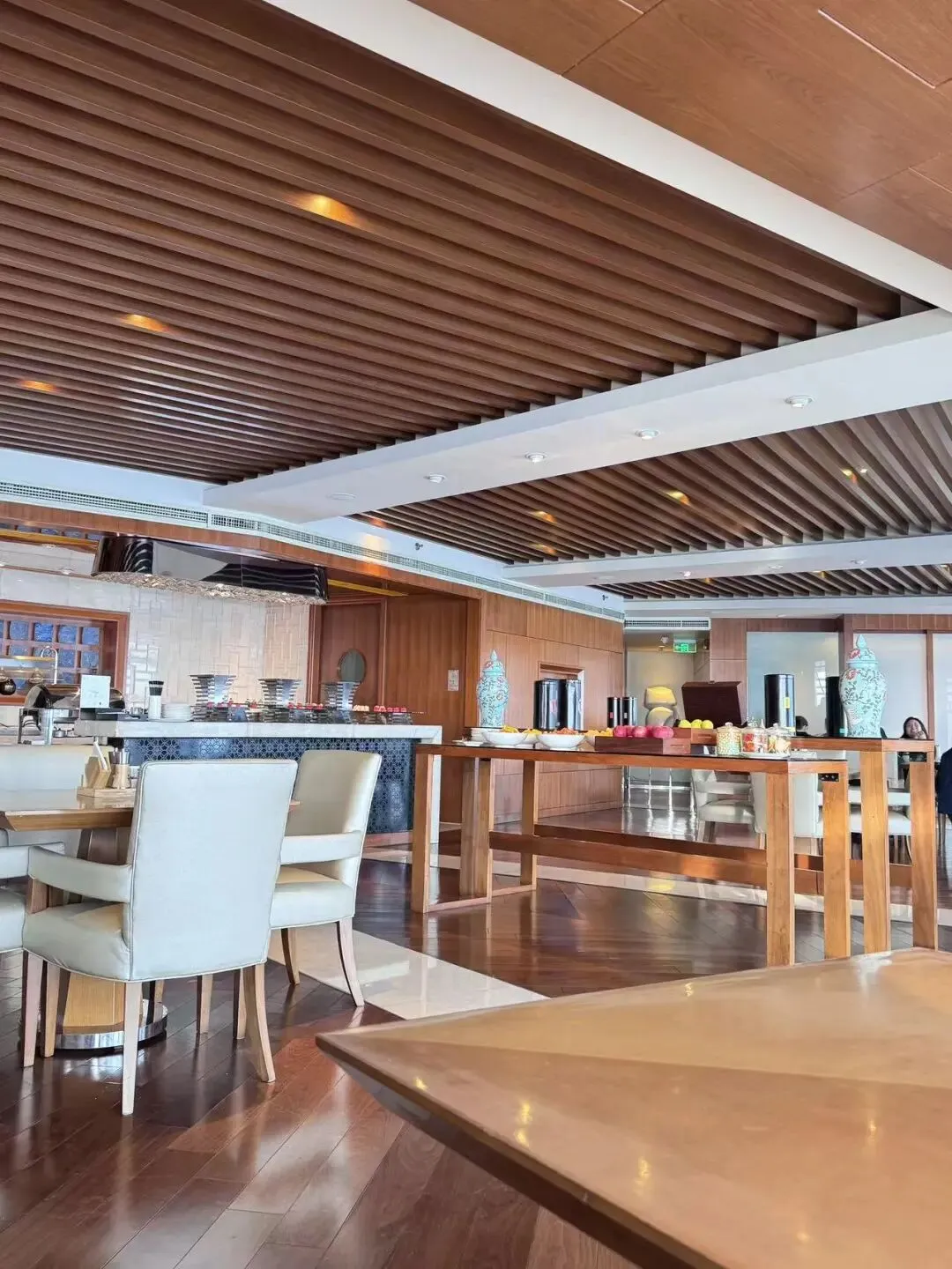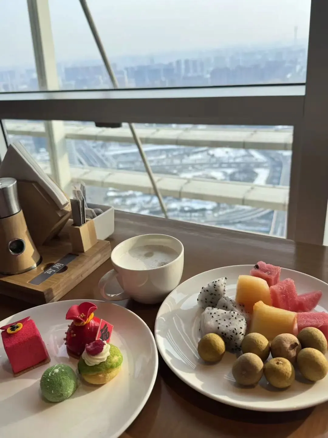 下午到41楼的行政酒廊吃下午茶。这纯粹就是一个发朋友圈的地方,糕点种类比较少,而且不好吃,喝的除了茶和咖啡,就是罐装的饮料。晚餐也在行政酒廊吃的,不得不说,它那个炒饭是冷的,菜式也很少,下次还是出去吃吧。(别喷说免费的就是这样的,房费包含了这项福利,就应该做好,不然别做。都说一分钱一分货,总不能钱收了,就用次充好吧?)。