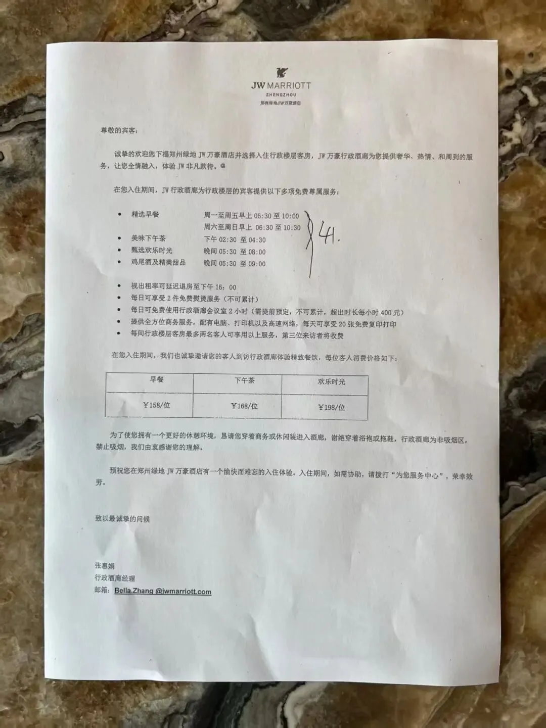 据说这家酒店是万豪集团在河南市场上唯一一家奢华五星级酒店,标榜不管是品牌标准还是服务上,都会给客人带来不一样的体验。但除了入住时候遇到行李生,和拦路的销售之外,我没感觉他们的服务有什么不一样的体验。没有欢迎水果,没有夜床服务,没有夜宵服务。早餐、下午茶、晚餐的出品都很一般。有浴缸却没有提供一次性的浴缸套,电子体重秤还是没电的。退房也没有伴手礼。