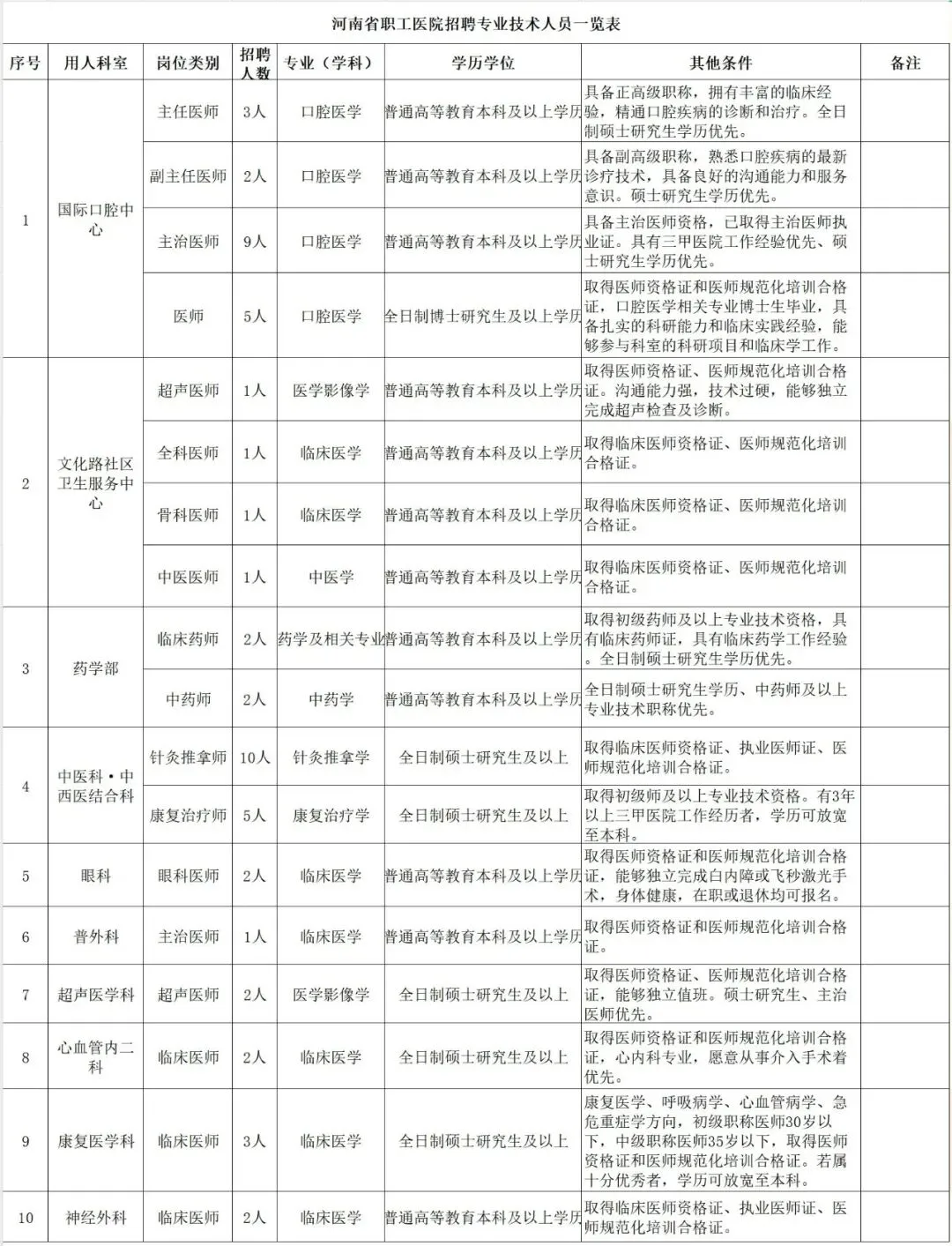 详见附件《河南省职工医院公开招聘专业技术人员一览表》。