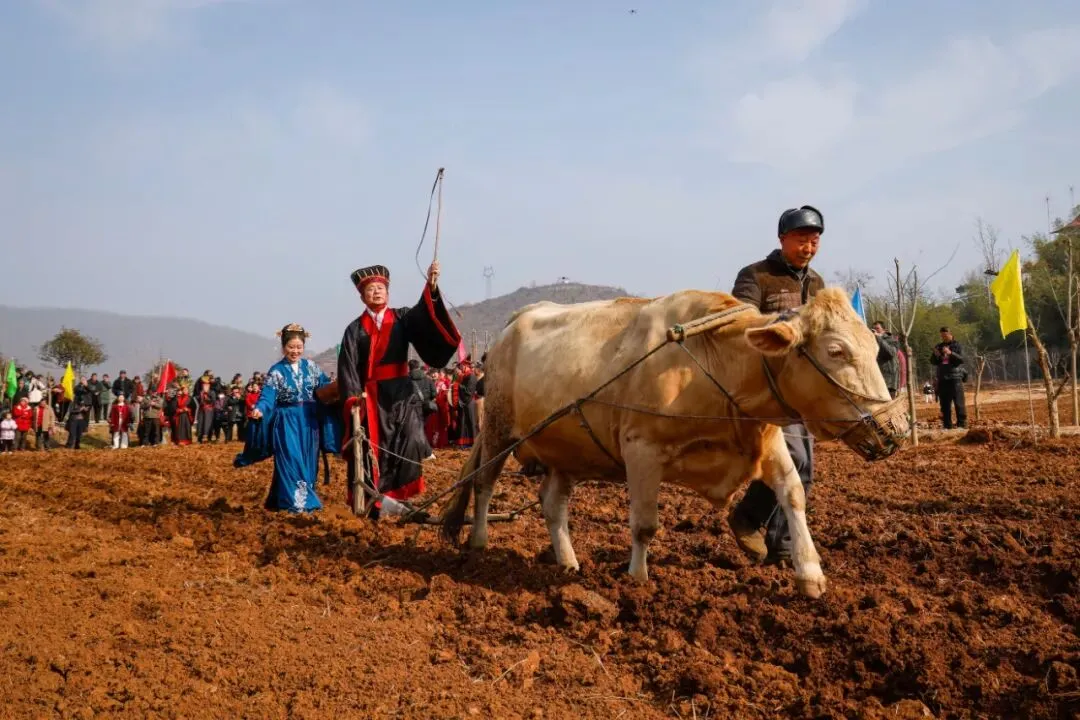 2月4日,“豫见立春 万象启新”河南省丙午年二十四节气立春盛典活动(南阳分会场),“县官大人”和“夫人”正在开展春耕,吸引众多群众前来观看。孙国兴 摄